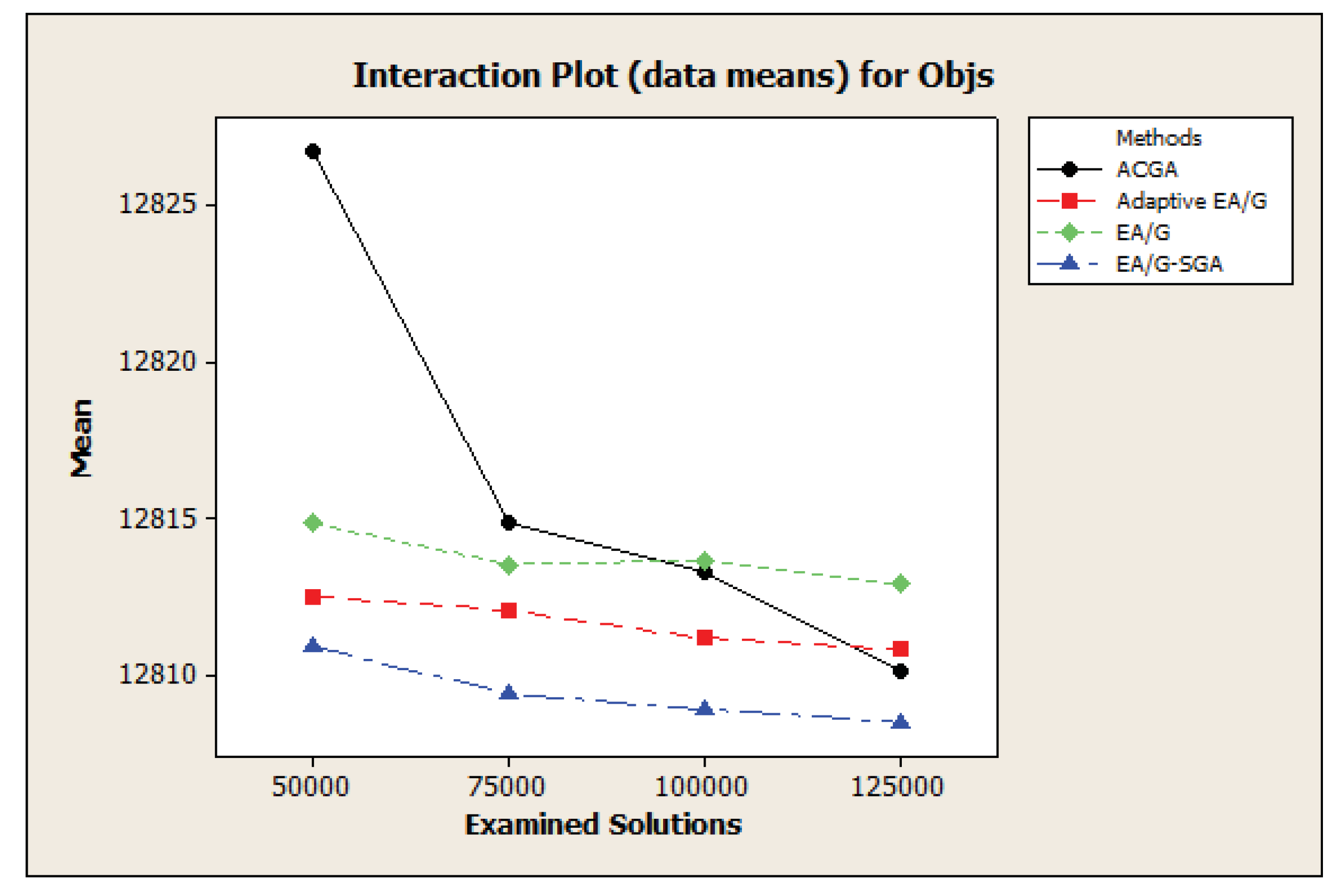 Figure 3), EA/G-GA performs well by all stopping criteria while the ACGA is greatly improved when we employ more examined solutions. The convergence plot (See