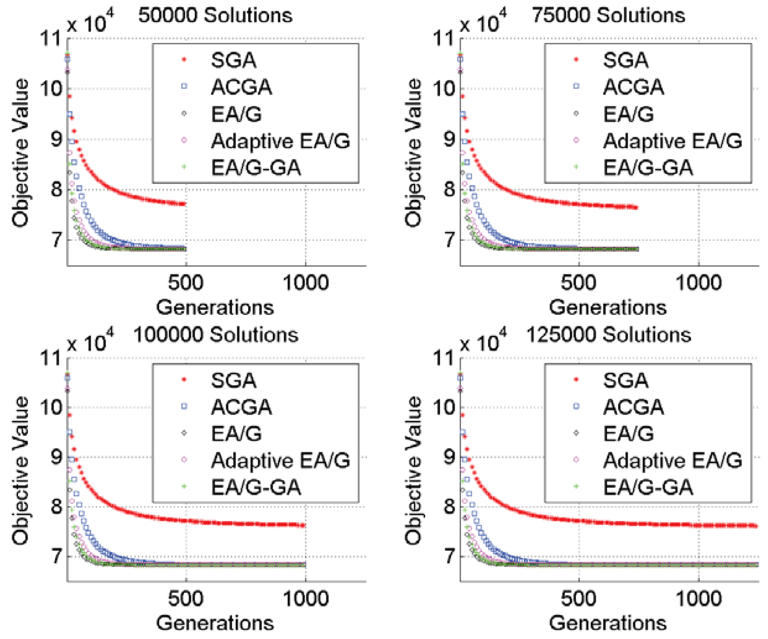 Figure 4) depicts that EA/G converges very fast before 150 generations. Other algorithms, nonetheless, gradually enhance the solution quality through the evolutionary progress. Thus, EA/G does not outperform either the EA/G-GA or Adaptive EA/G.