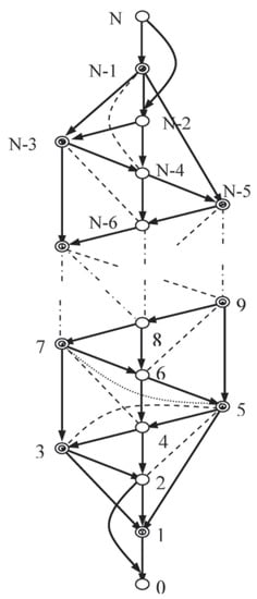 The graph displays an ancestral ordering, of single variables. The configuration at the top of the graph will depend on the number of sides to left and right.