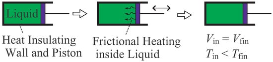 An example of adiabatic process is shown in Figure 1. In this example, the system under consideration is a liquid enclosed in heat insulating cylinder and piston. An adiabatic process is realized by a fast oscillation of piston. Even when the volume of liquid does not change at initial and final thermal equilibrium states, the frictional heating inside the liquid increases the temperature []. The energy which causes the frictional heating is the mechanical work operated by piston, and hence this process satisfies the definition of adiabatic process. This adiabatic process is irreversible due to the frictional heating.