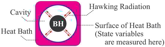 The theoretical basis for regarding a black hole as a thermal equilibrium state of gravitational field is given by the quantum field theory on black hole spacetime, which concludes that any matter field is radiated from the black hole horizon with thermal spectrum (Hawking radiation) [,]. The suitable situation for considering the black hole thermodynamic is shown in Figure 2: Enclose a single black hole in a concentric spherical cavity. Adjust the temperature of heat bath to that determined by the thermal spectrum of Hawking radiation. Then, the energy coming from the black hole to surface of heat bath due to the Hawking radiation, which is absorbed by the heat bath, balances completely with the energy coming from the heat bath to black hole due to the thermal radiation emitted by heat bath. Thus, the two-component system, which consists of the black hole and radiation in cavity, is in a thermal equilibrium state of temperature of Hawking radiation.