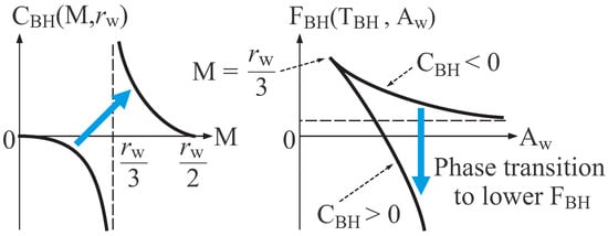 We should specify the range of parameters, M and , so as to let the thermal equilibrium state of black hole be thermodynamically stable. Figure 3 shows schematic graphs of heat capacity as function of M and , and free energy as function of and . We find that the thermal equilibrium state of black hole is thermally unstable for due to negative heat capacity, while it is thermally stable for due to positive heat capacity. From solely the behavior of heat capacity, one may think that black hole thermodynamics is ill-defined, since thermal stability is not necessarily ensured. However, if we assume that the criterion of phase transition in ordinary thermodynamics is applicable to black hole, it is concluded from the behavior of shown in Figure 3 that an unstable equilibrium state is transformed to a stable one under the environment of constant temperature, because . This denotes that a consistent thermodynamic formulation of thermal system shown in Figure 2 is expected for the range of parameters,