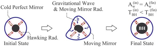 For the process shown in Figure 4, let the initial and final equilibrium states have the same system size, , and the intermediate states be non-equilibrium states as follows. Suppose that the shape of cold perfect mirror is deformed dynamically by some mechanical work, and the mirror keep moving during the process. By this moving mirror, there arise classical and quantum effects. The classical effect is the radiation of gravitational wave due to asymmetric motion of the mirror. By the argument of general relativity, the energy of black hole does not decrease by this classical effect. The quantum effect is the moving mirror radiation created due to the motion of mirror, at which a boundary condition is imposed on quantum fields [,]. The quantum radiation by moving mirror is analogous to Hawking radiation in the sense that the time evolution of boundary condition of quantum fields changes the quantum vacuum state and creates quantum particles which constitute the radiation []. Because the moving mirror radiation injects an energy from mirror to black hole, the energy of black hole increases also by this effect. Therefore, during the process shown in Figure 4, the black hole is non-stationary and increases its energy due to the classical and quantum radiation by moving mirror. Such a radiation by moving mirror corresponds to the frictional heating in the adiabatic process of laboratory system shown in Figure 1. Furthermore, by Equations (10) and (14), it is found that, within the parameter range (16), the increase of thermodynamic energy due to the effects of moving mirror results in the increase of mass M, and the increase of M causes the increase of . Hence, the black hole temperature increases in the adiabatic process shown in Figure 4 as that of laboratory system shown in Figure 1.