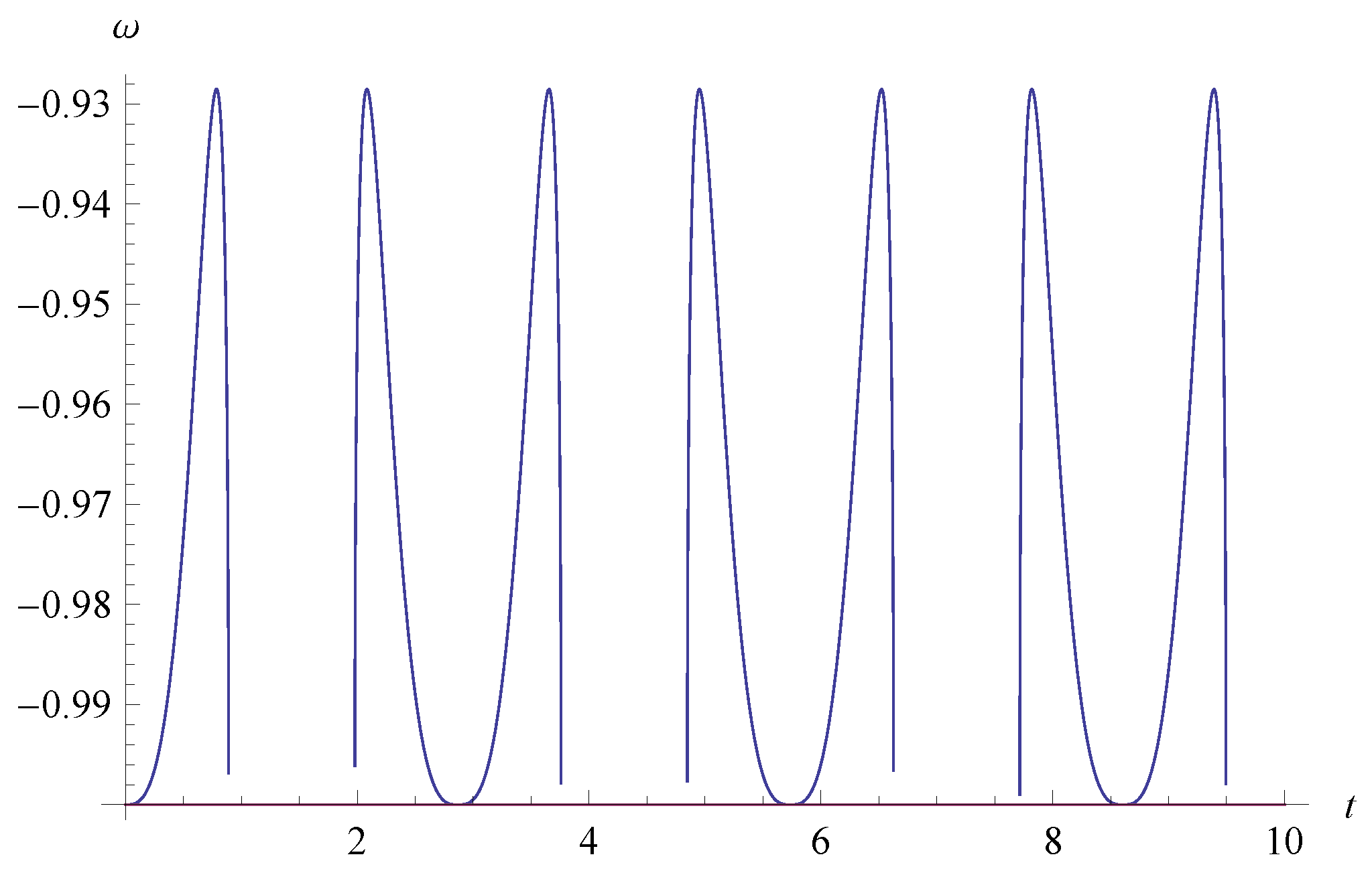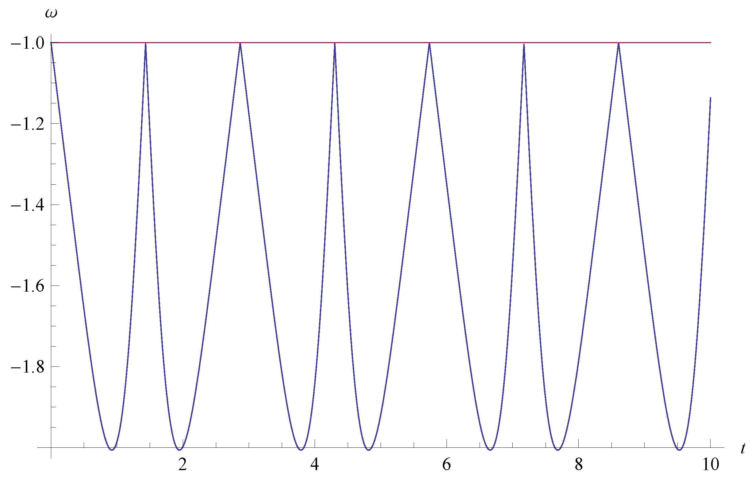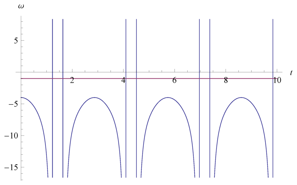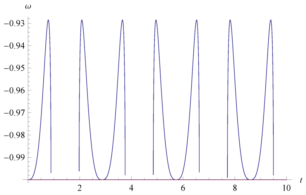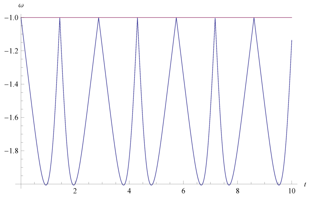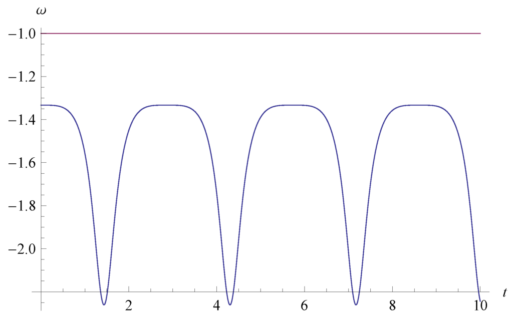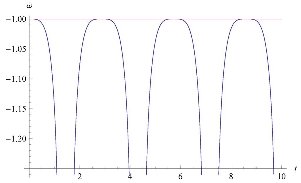 In Figure 1, we show the cosmological evolution of EoS ω as a function of t for , i.e., the model parameters of the Weierstrass invariants of and . From Figure 1, we see that the universe always stays in the phantom phase (). Hence, this model is ruled out. Furthermore, we find the two periodic oscillatory behavior of ω.