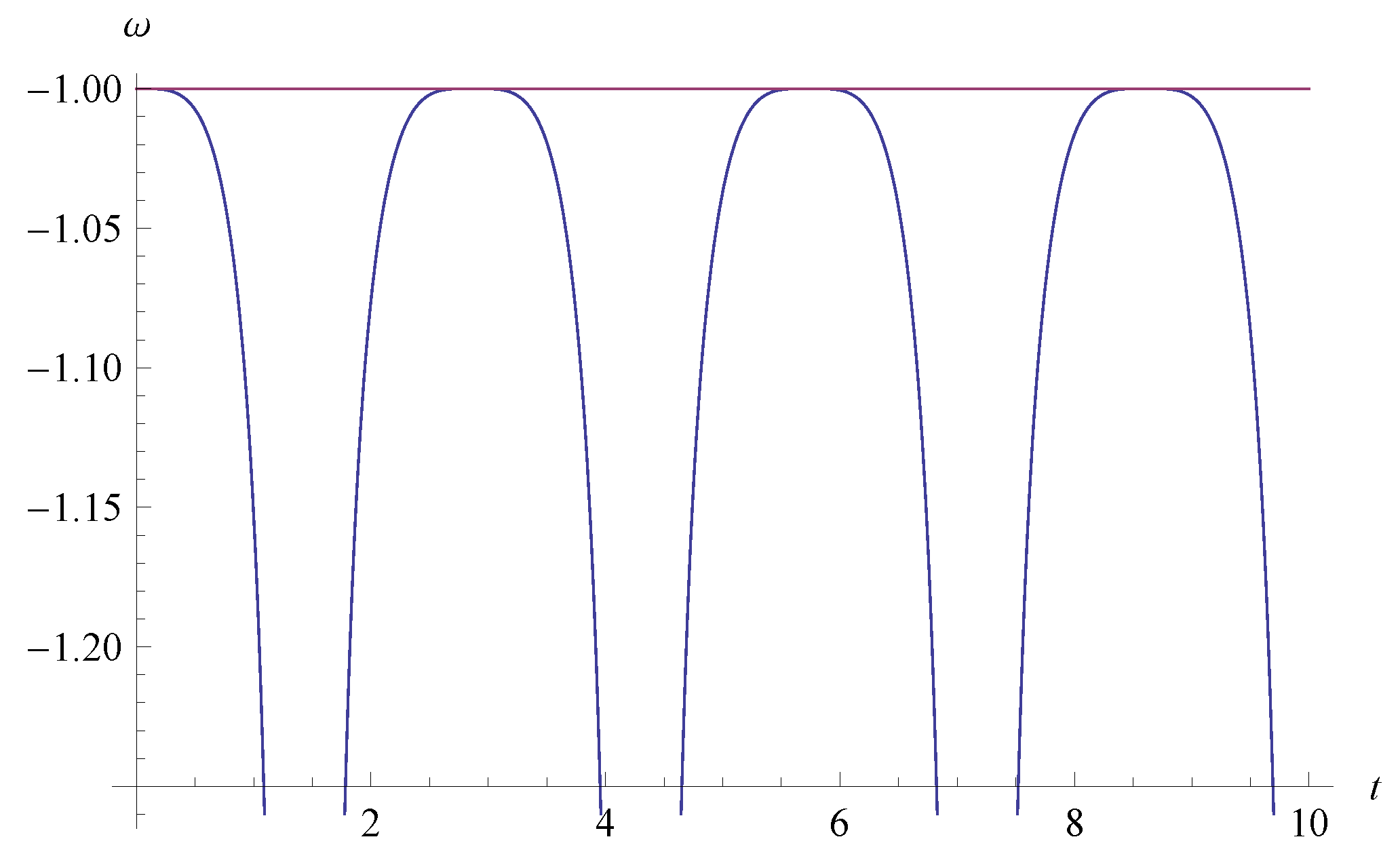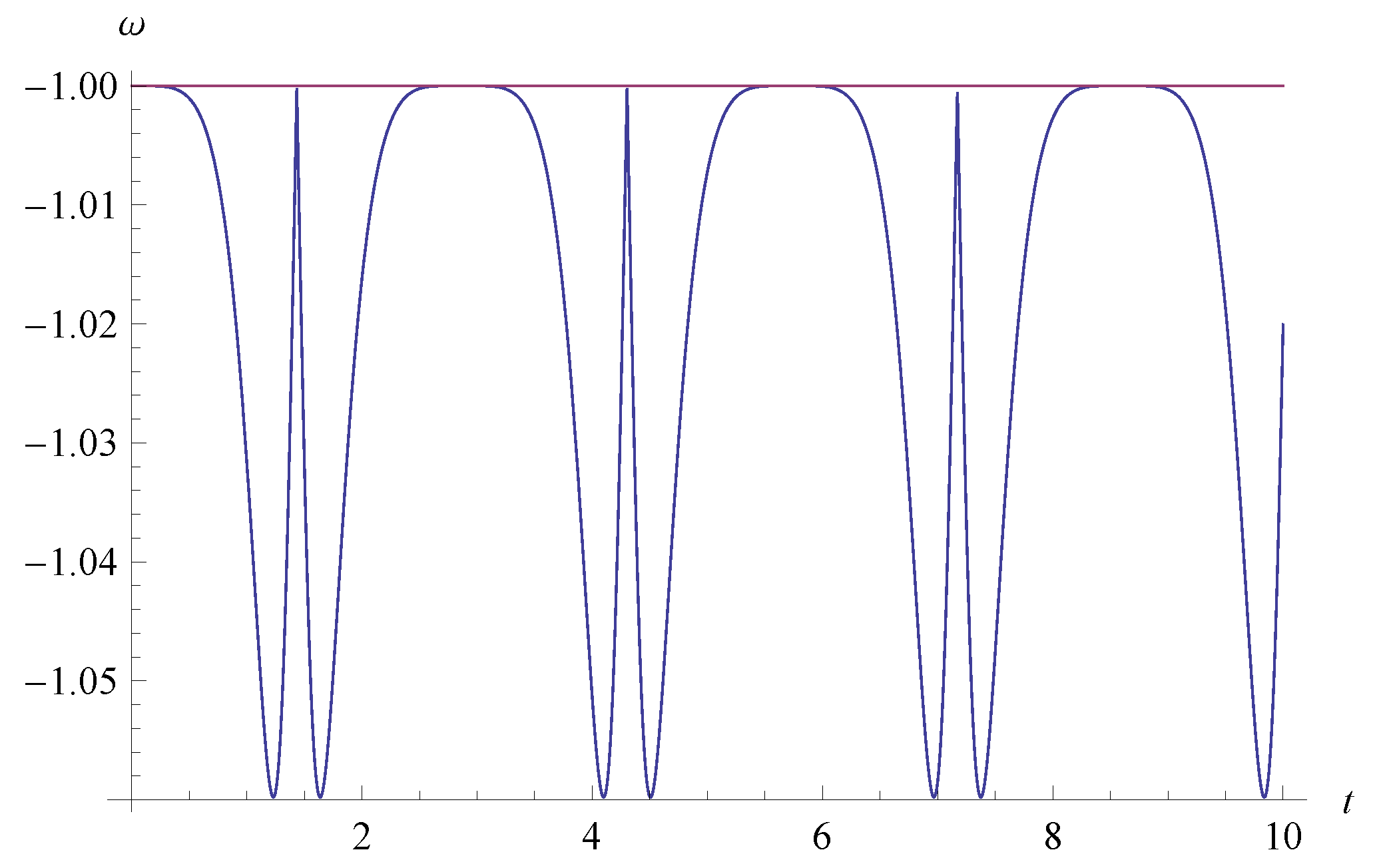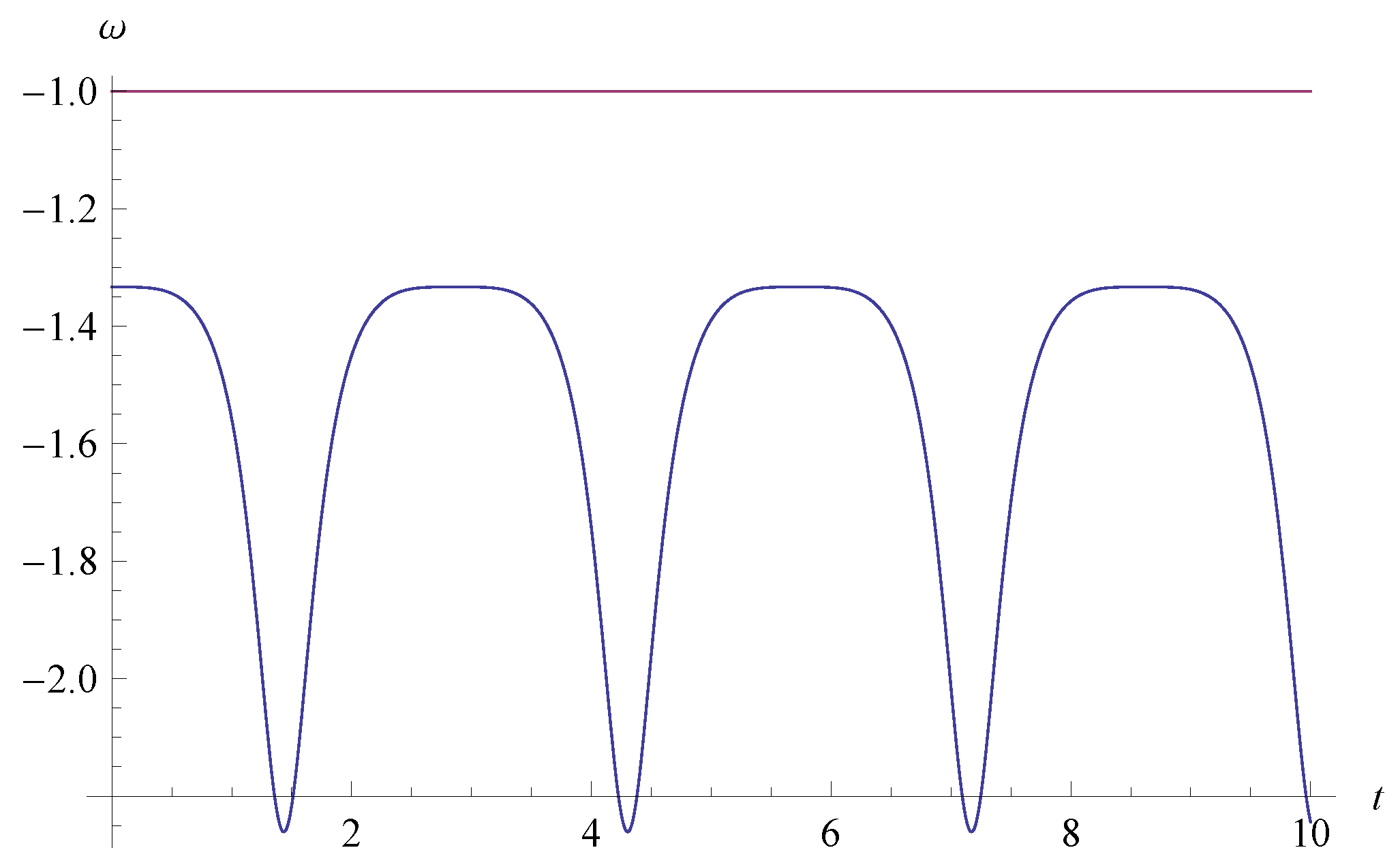 The EoS ω in Equation (29) as a function of t for , i.e., the model parameters of the Weierstrass invariants of and . The line of is also plotted.