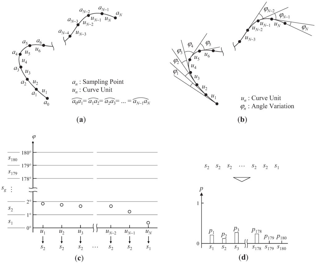 Extraction of the angle variation distribution. (a) Sampling point and a curve unit; (b) Sampling of the angle variation; (c) Quantization based on the angle variation; (d) Calculation of the occurrence probability.