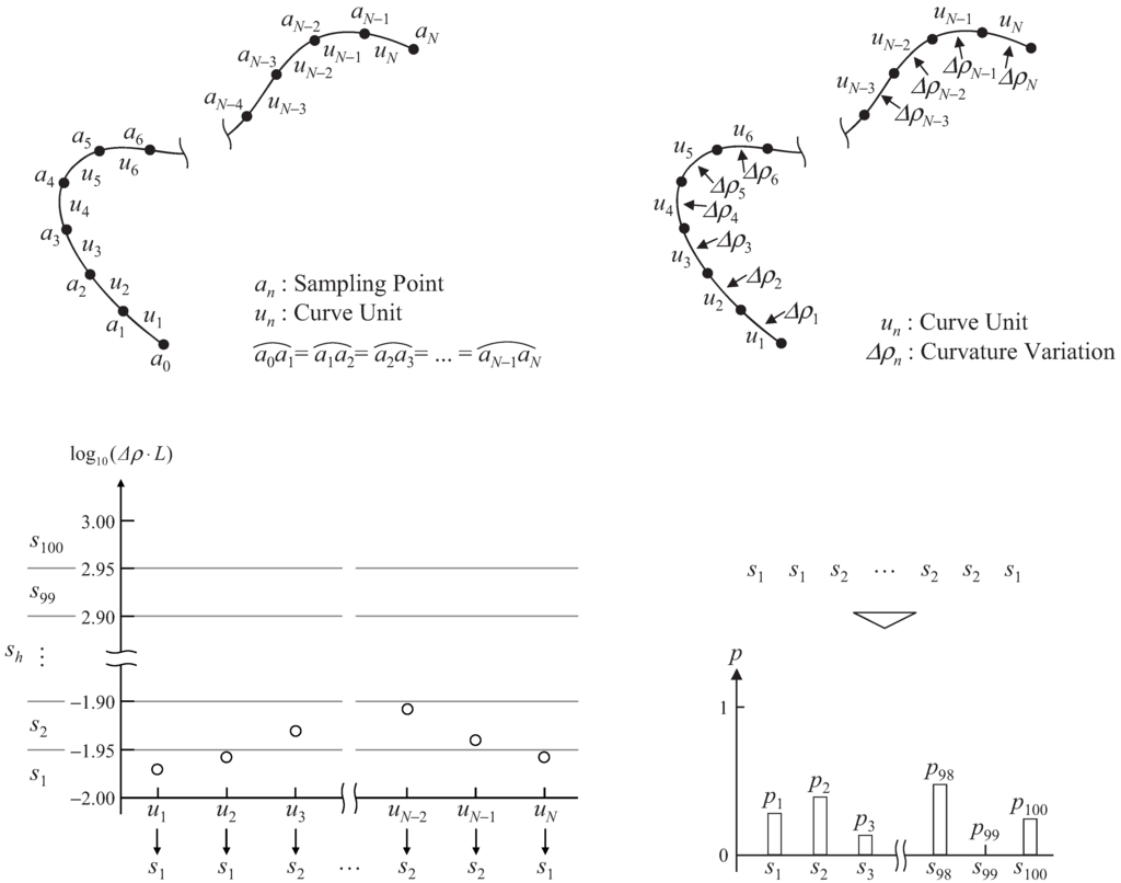 Entropy and the expected curvature variation are calculated using the following procedure. First, the curved profile is divided by sampling points into N equivalent curve units to curvature ρ (Figure 2a). Then the curvature variation in each curve unit Δρn is calculated (Figure 2b) as: