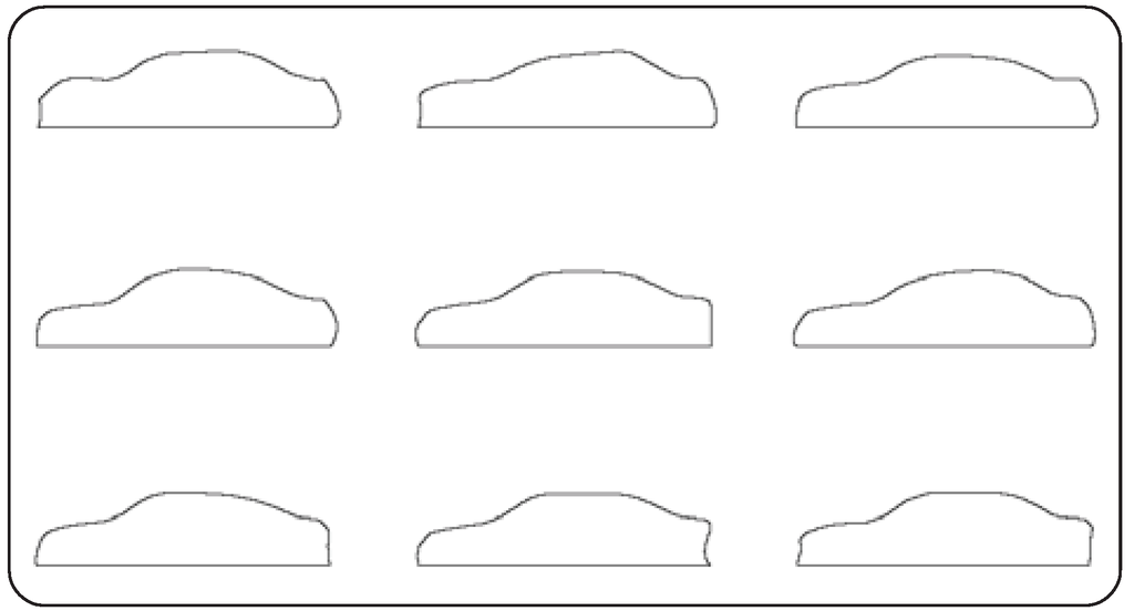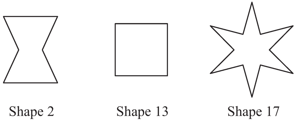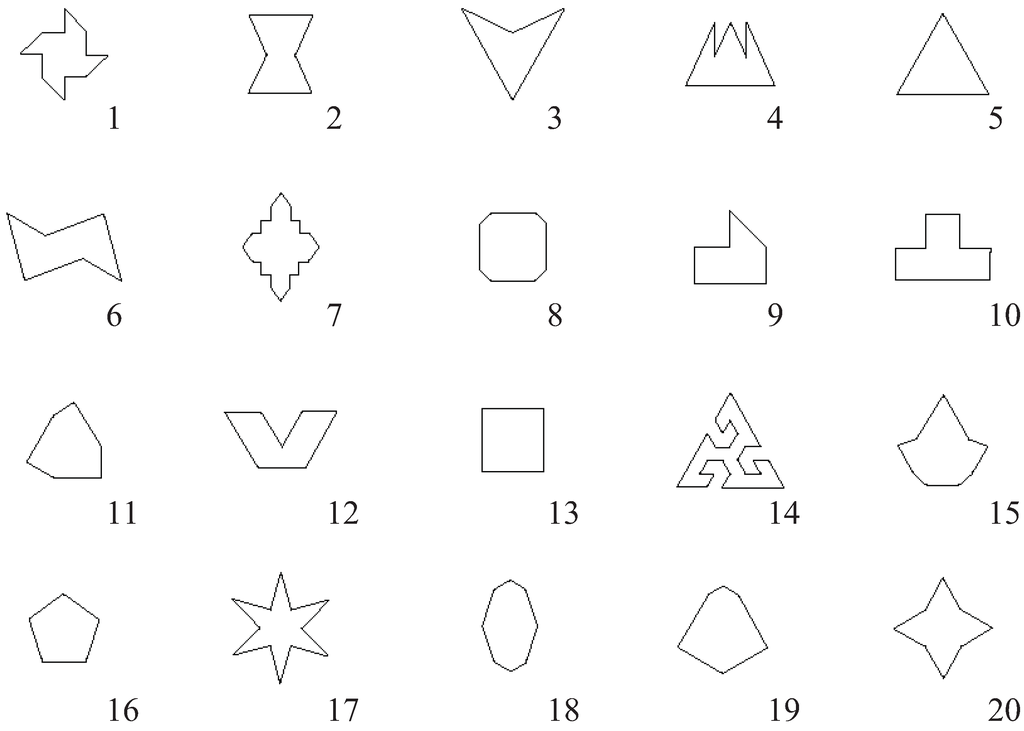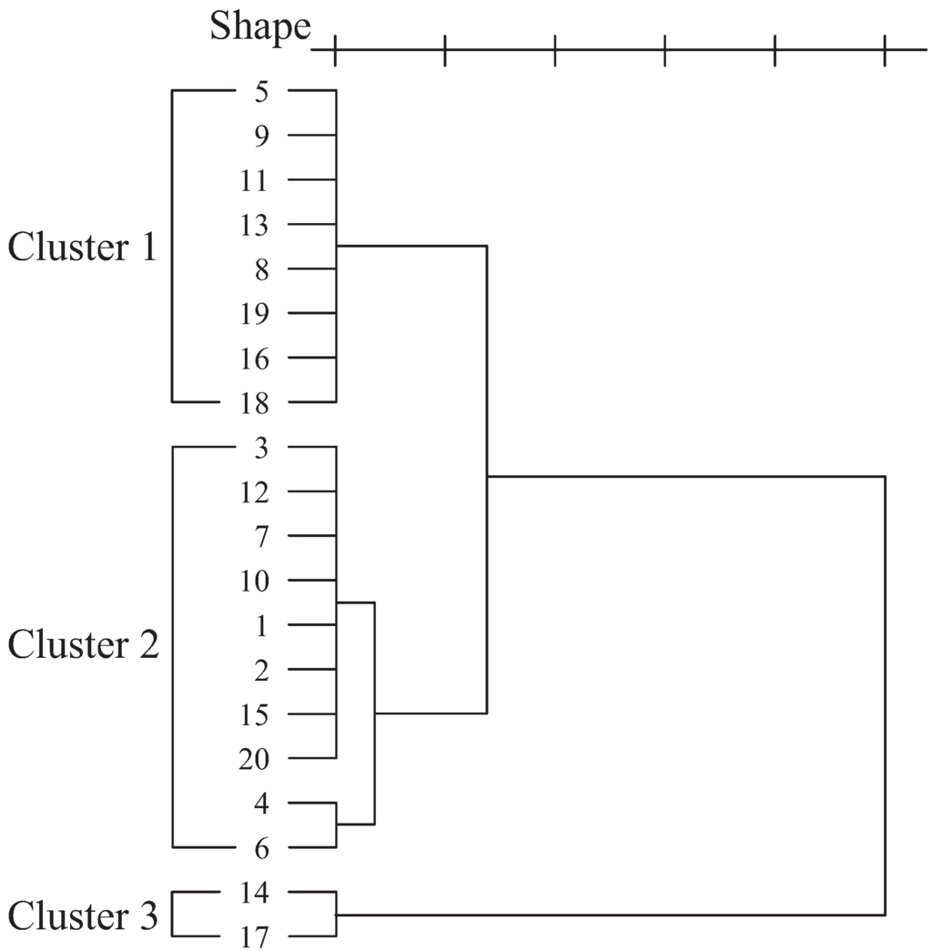 To create basic curved profiles based on standard polygonal profiles, we selected some polygonal profiles from the 90 polygonal profiles used in the “Aesthetic Measure” by Birkhoff, who is a pioneer in employing an experimental psychology approach in the field of “aesthetics” [20]. We classified 90 polygonal profiles on the basis of similarity, and extracted 20 polygonal profiles to represent each similarly shaped group using the KJ method [21] (Figure 4). Among the 20 polygonal profiles, cluster analysis in which the microscopic shape information is used as a variable, is performed. Table 1 shows the microscopic shape information used in the analysis. This information can be applied to curved profiles and serve as variables for quantitative classification in a conventional study [6]. Consequently, the polygonal profiles are classified into three clusters (Figure 5). We selected shapes 2, 13, and 17 as basic polygonal profiles (Figure 6).