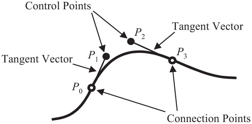 In the present study, a three-dimensional Bézier curve is used to describe basic curved profiles. Various curved profiles can be constructed by connecting several three-dimensional Bézier curves [22,23]. As illustrated in Figure 7, P0 and P3 are defined as connection points, P1 and P2 are defined as control points, and and are defined as tangent vectors. The position of the connection point, the direction of a tangent vector, and the size of a tangent vector are defined as curve control variables.