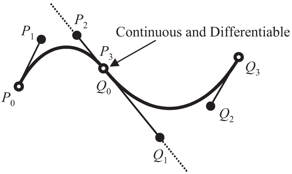 A condition to describe a smooth curved profile is necessary when the curved profile is expressed as a connection of several curve segments. The condition is defined such that P3(Q0) is located on P2 Q1, as shown in Figure 8. In other words, a three-dimensional Bézier curve with a continuous and differentiable connection point satisfies the following equation: