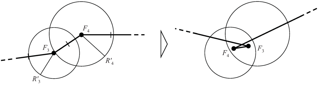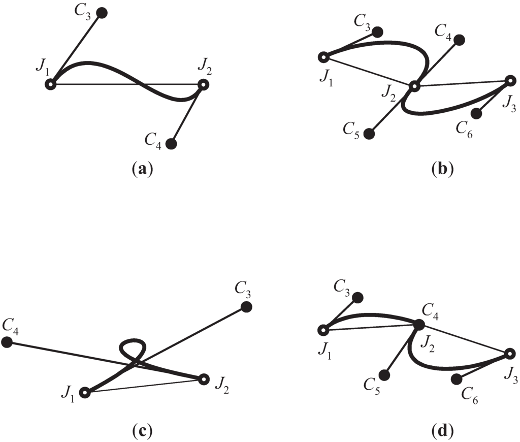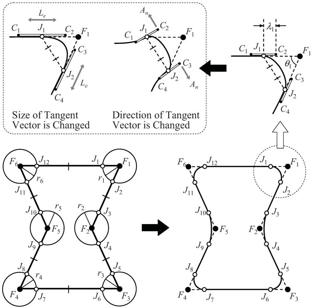 The movable range in the angle of the tangent vector at each connection point is defined as follows (refer to Figure 15f). For differentiable connections, J1, C2, and C3 always form a line, and J1 C3 is linked to J1 C2. Here, ∠C3 J1 J2(<π/2) is calculated as follows when C2 is on the same side as F2 :