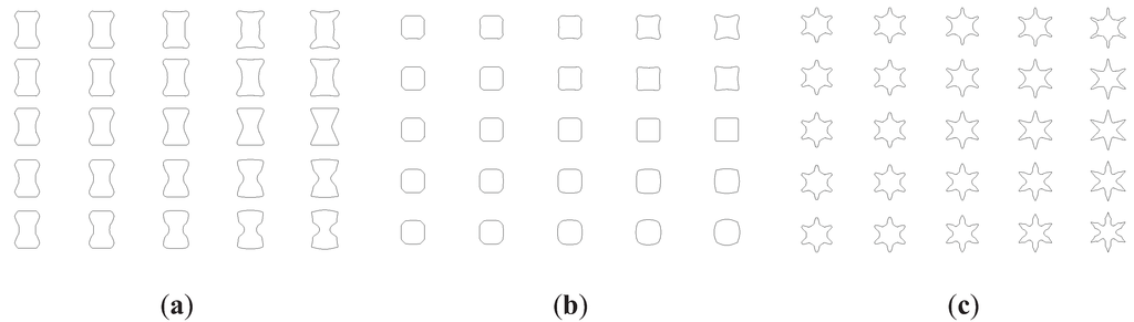 Basic curved profiles. (a) Curved profiles based on shape 2; (b) Curved profiles based on shape 13; (c) Curved profiles based on shape 17.