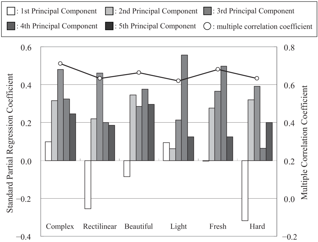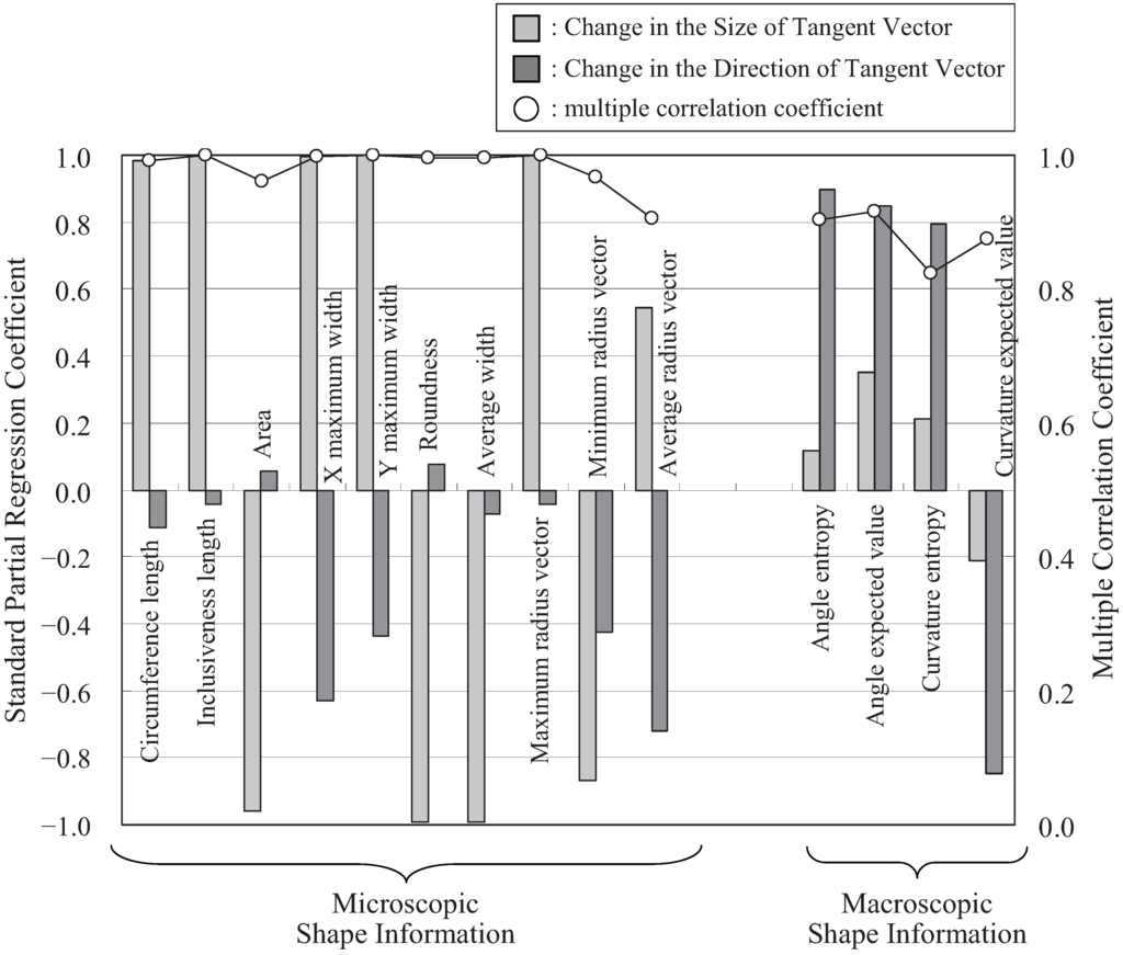 The relationship between shape information and the changes in size and direction of the tangent vector in curved profiles is analyzed. We performed a multiple regression analysis in which the changes in the size and direction of the tangent vector are explanatory variables, and the shape information is set as a variable (Figure 11). The multiple correlation coefficient exceeds 0.8 for all of the purpose variables, which have significance levels below 1%. Moreover, for the microscopic shape information, the standard partial regression coefficient for the change in the size of tangent vector (CLe) tends to be larger than that for the change in the direction of tangent vector (CAn). On the other hand, for the macroscopic shape information, CAn tends to be larger than CLe. Consequently, as mentioned in Section 3.3.1, macroscopic shape information differs from the microscopic shape information in basic curved profiles.
