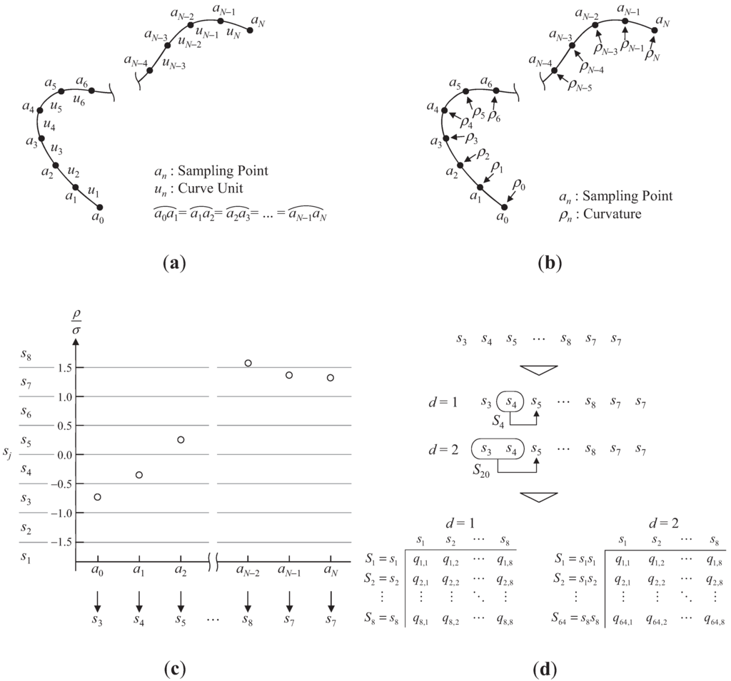 Extraction of the curvature variation distribution. (a) Sampling point and a curve unit; (b) Sampling of the curvature variation; (c) Quantization based on the curvature variation; (d) Calculation of the occurrence probability.