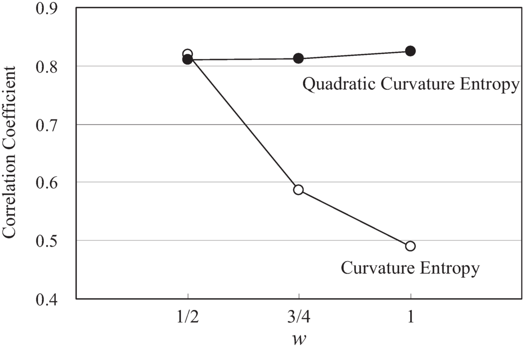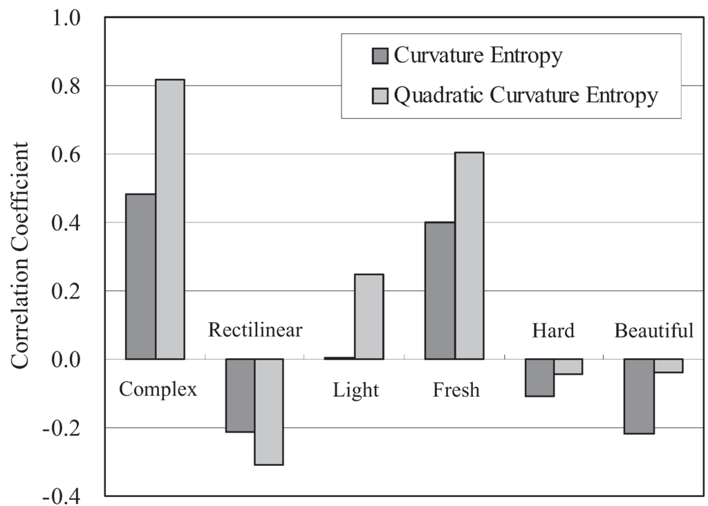 The correlation between the cognition information (as a purpose variable) and the curvature entropy (as an explanatory variable) is analyzed. As shown in Figure 24, the correlation coefficient between the quadratic curvature entropy and cognition information (complexity) exceeds 0.8 regardless of the degree of freedom in the shape generation. On the other hand, the correlation coefficient between the curvature entropy and complexity decreases according to the degree of freedom of shape generation. The significance levels for all conditions are less than 0.01.