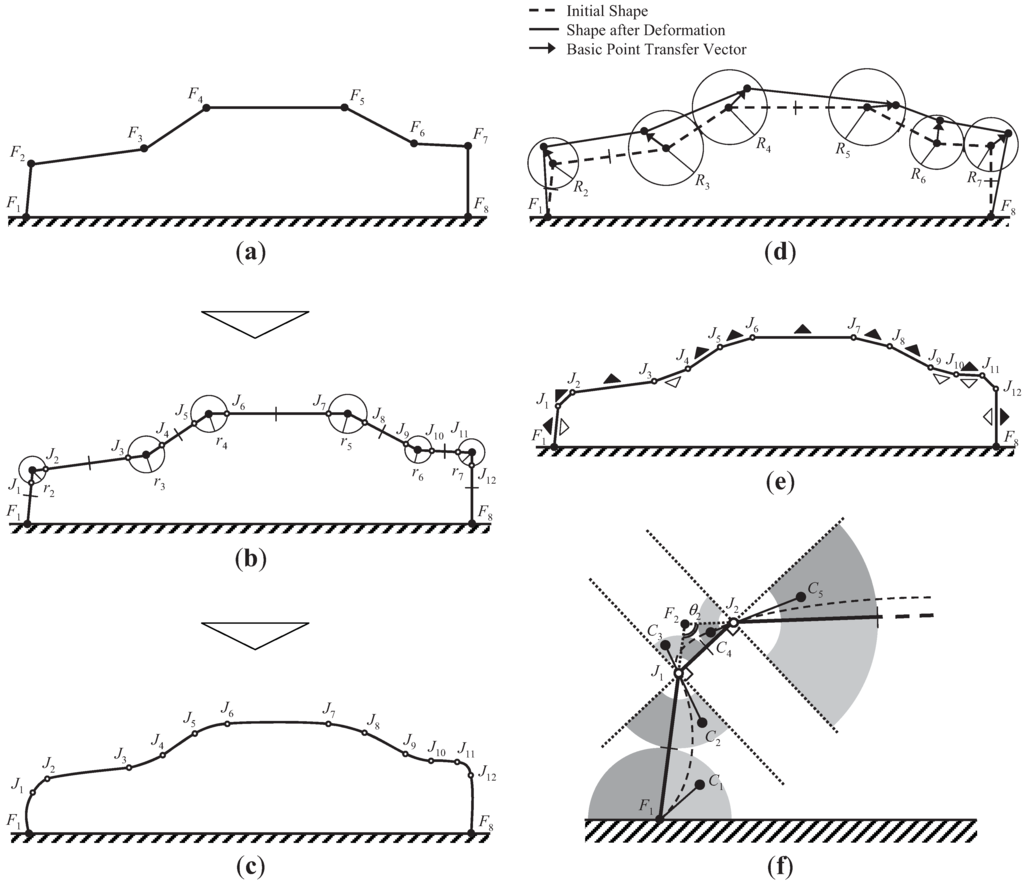 During shape generation, points F1 and F8 are fixed, while points F2 through F7 are movable. The basic point transfer vector is defined to begin from the basic point toward the deformed points (Figure 15d). The movable ranges of points F2 through F7 are defined as circles with radii R2 through R7 (Figure 15d). The radii are defined by the following equation:
