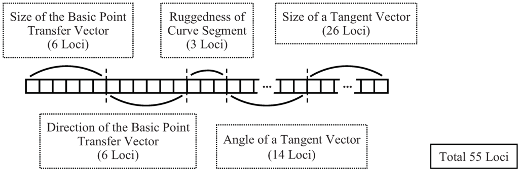 A genetic algorithm is applied to the shape generation method. The curve control variables (the position of the connection point, direction of a tangent vector, and size of a tangent vector) are defined, and the chromosome for the genetic algorithm is composed of an arrangement of real numbers nreal (0 < nreal < 1), which adjust the curve control variable as described below.