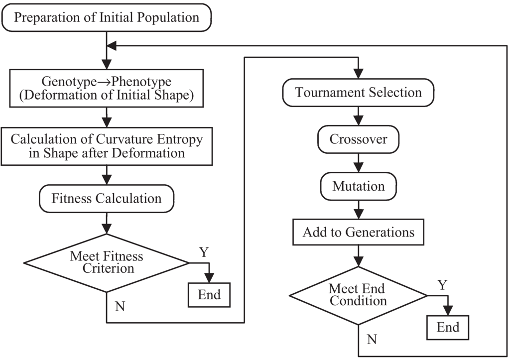 where HQCI is the quadratic curvature entropy in the initial shape, HQCD is the quadratic curvature entropy in the phenotype, and ΔHQC is the target variation of the quadratic curvature entropy. The crossover and mutation are conducted in the same manner described in a conventional study [27]. The random weighted mean of the real number variable is used for the crossover and mutation rate is set to 20%. The elite saving strategy and tournament selection are used for the selection. The population size (number of the combination of chromosomes) is set to 20. Figure 19 shows the flow of the search algorithm.