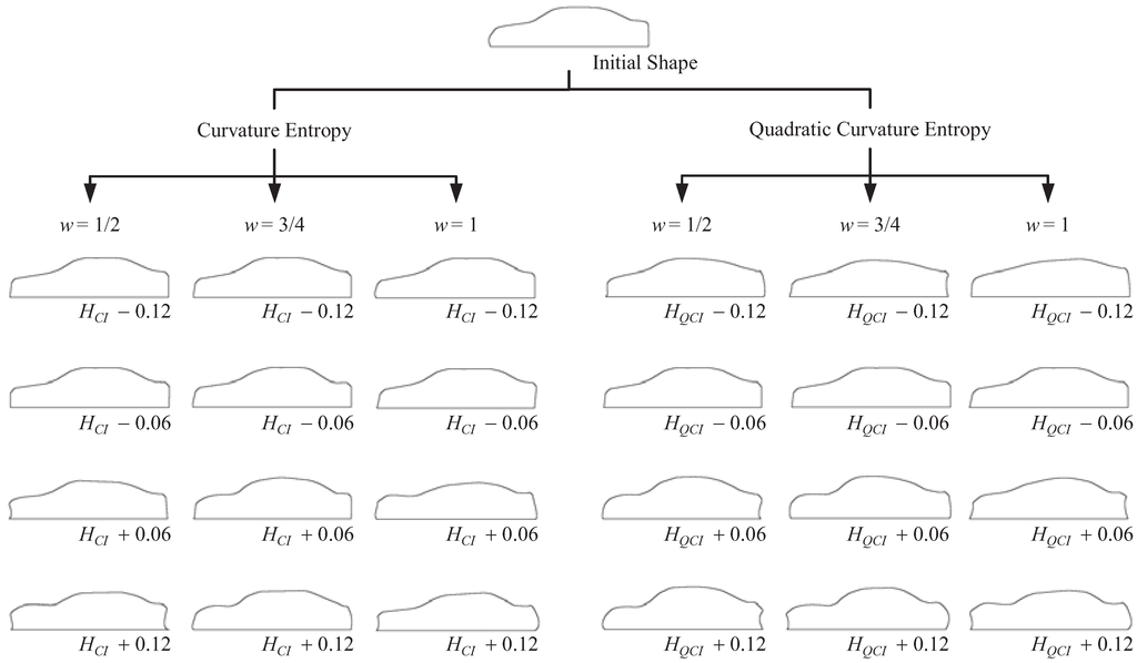 The objective of this study is to propose macroscopic shape information to represent the overall shape features in curved profiles and to confirm its effectiveness. Section 2 describes the proposed entropy as macroscopic shape information of a curved profile. In previous research on the texture and pattern of the cell structure [14,15], entropy in information theory has been used as an index to represent macroscopic features. Herein the concept of entropy is improved to represent the macroscopic features of curves. Section 3 describes the characteristic analyses of the shape information, including the proposed entropy, while Section 4 improves the proposed entropy in an effort to evaluate the continuity of a curve and to analyze the difference between the two proposed entropies. Based on our previous study [16], Section 5 describes a shape generation method using a genetic algorithm and the entropy as a calculator and shape generation index, respectively. Then to examine the availability of the method and index, this method is applied to the side view design of an automobile, which is expressed by a three-dimensional Bézier curve, and a cognition experiment using the generated shapes is conducted to confirm if the entropy adequately represents the cognition information.