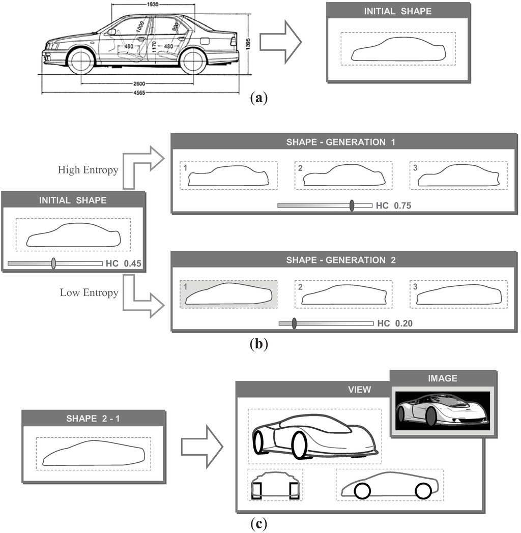 Figure 25 shows an image of a curved surface design support system based on the knowledge acquired in the present study. The flow of shape generation in this system is described below. First designers describe the initial shape based on a conventional side view of an automobile (Figure 25a). Then this system automatically generates a shape based on the variation of entropy set by the designers. Finally, the designers select one of the generated shapes after considering other factors (Figure 25b) and generate a three-dimensional model based on the selected shape (Figure 25c). Because the designers can control the complexity of the generated shape, the shape generation method described herein can support designers during the early stage, which is when the designers must decide the overall impression of the design.