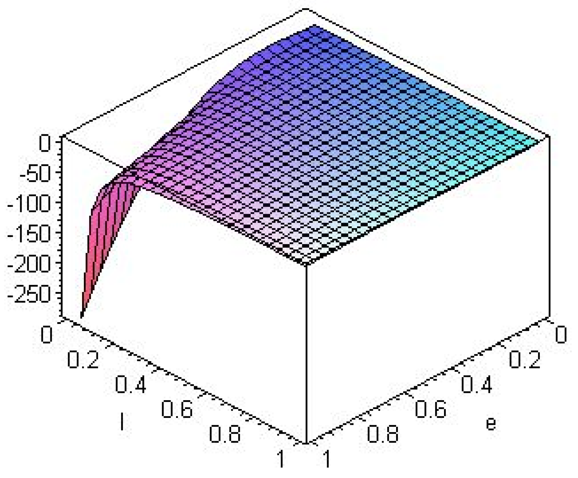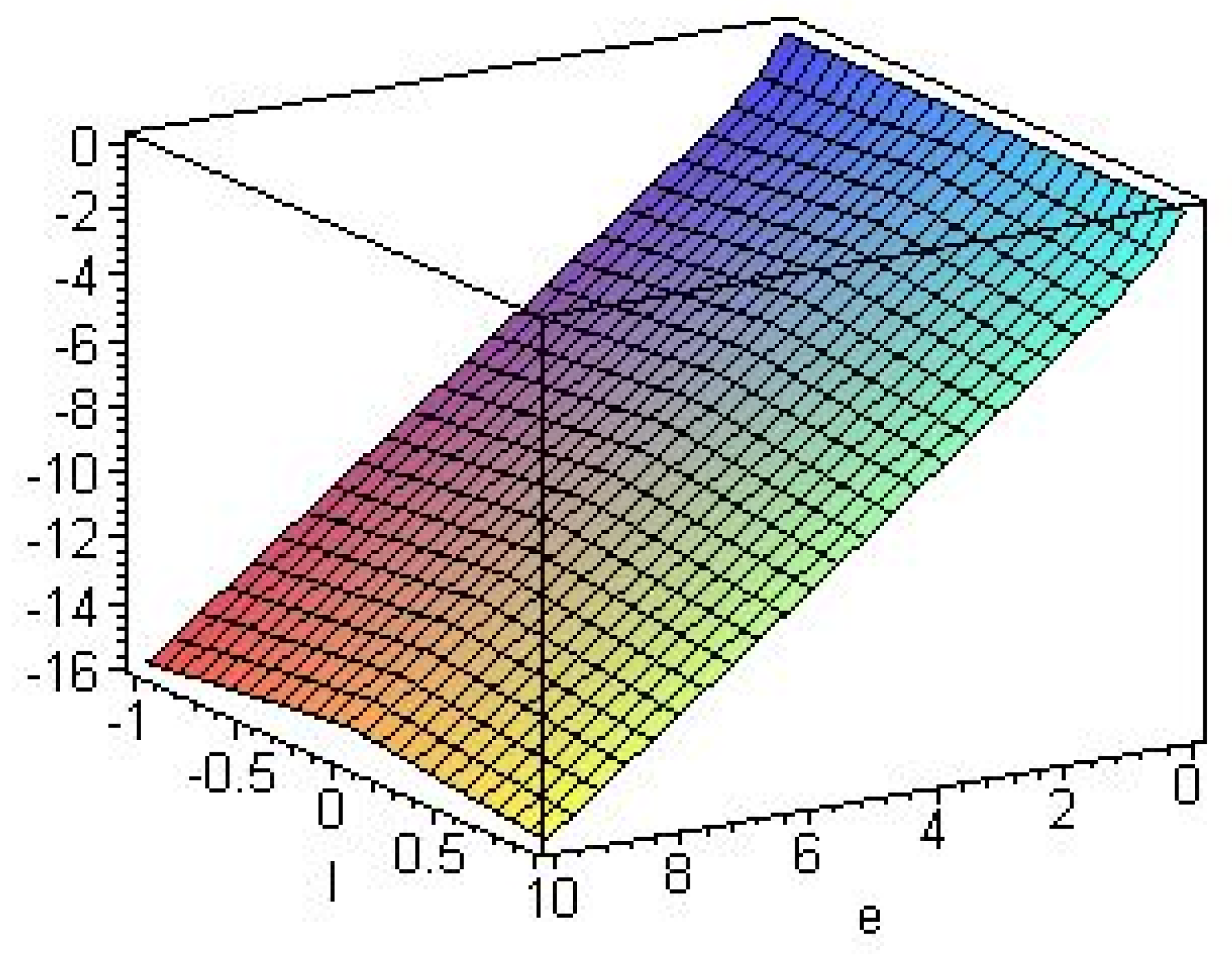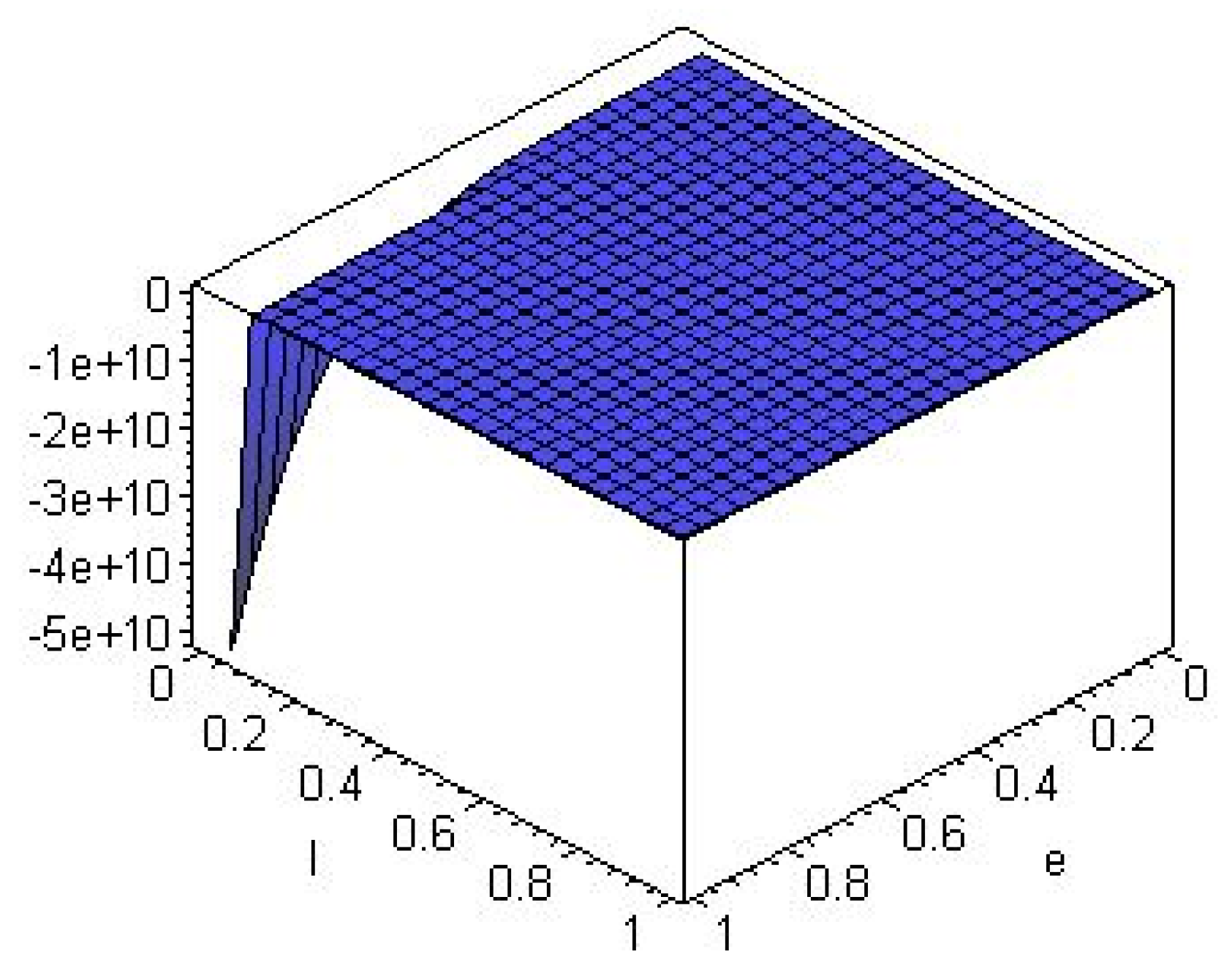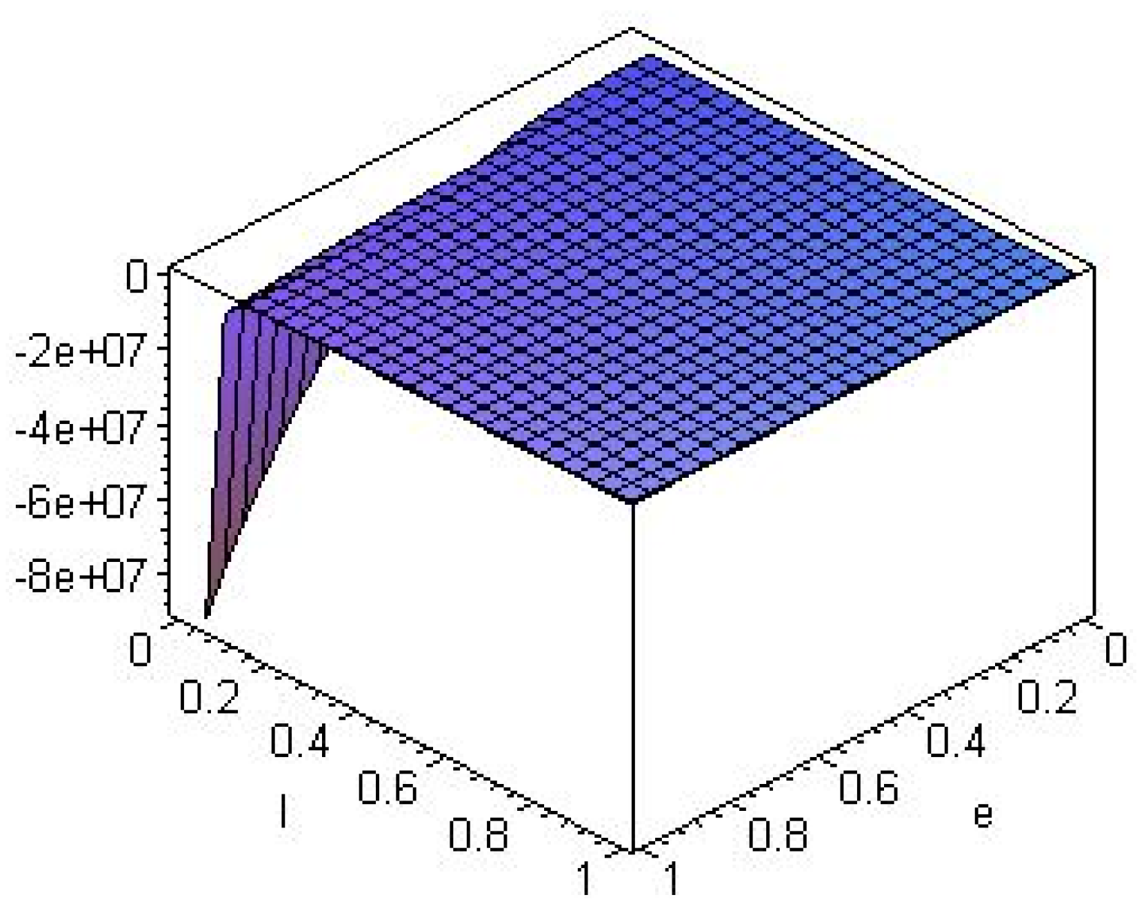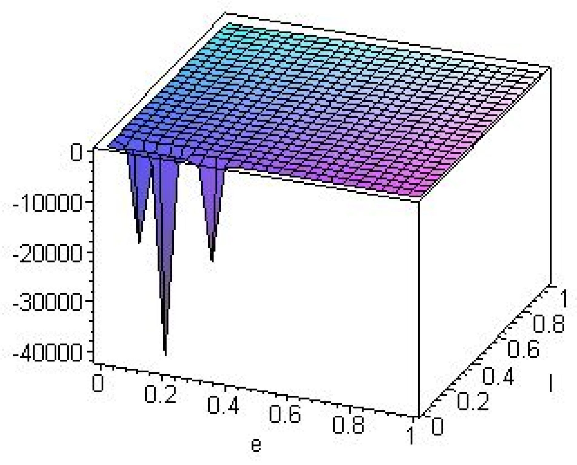 As mentioned the previous case, we find in this case, in the range of and , that the fluctuation of the components lie in a negative interval. Namely, the components lie in , while the components lie in . This shows that the topological Einstein–Yang–Mills black hole in arbitrary space-time dimension are locally unstable configurations with respect to the fluctuations of the . In fact, the range of the growth of happens to be in the same negative limit of the amplitude under the flow of the parameters . Explicitly, from Figure 13 and Figure 14 we observe that the of growth of the and takes place in the limit of a large l for all e. On the other hand, the component involving two distinct parameters of black hole has been depicted in Figure 15. In this case, we notice that Figure 15 shows that the -component of the mass fluctuations lies in the interval . Thus, for a given ensemble of higher dimensional topological Einstein–Yang–Mills black holes, the components of the metric tensor indicate that the fluctuations involving the vacuum parameters have relatively meager positive numerical values and thus they are prone to yield a statistically unstable ensemble at this order of the ADM mass.