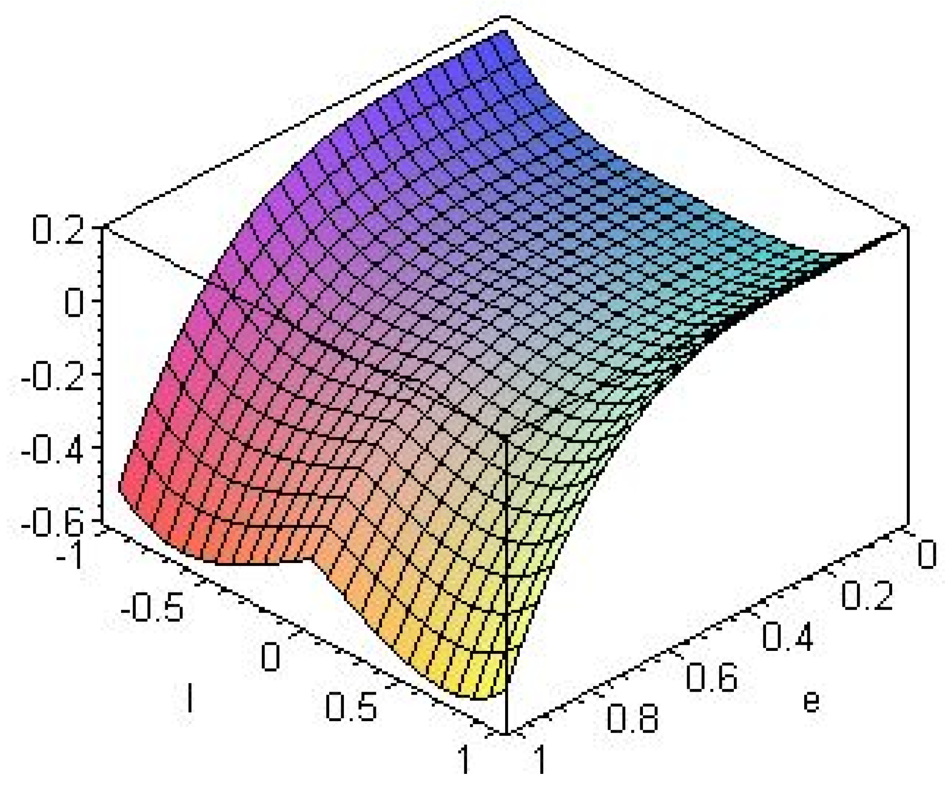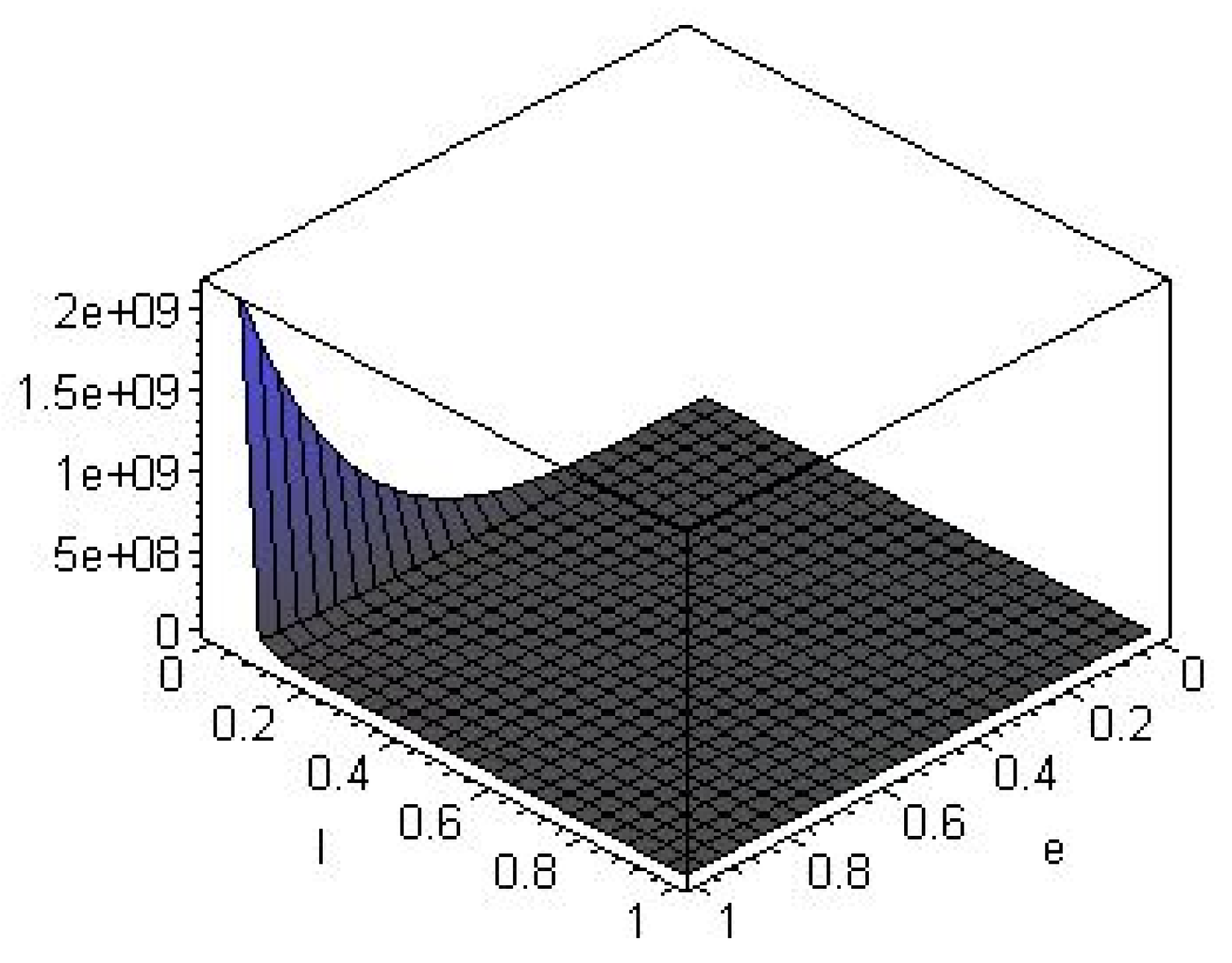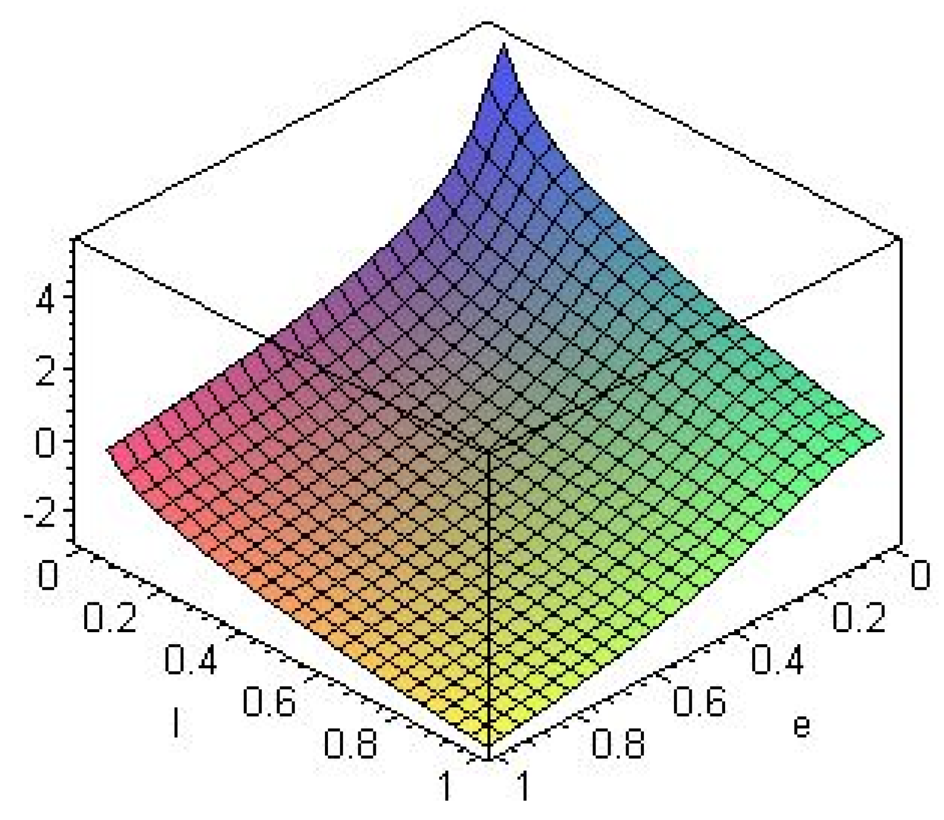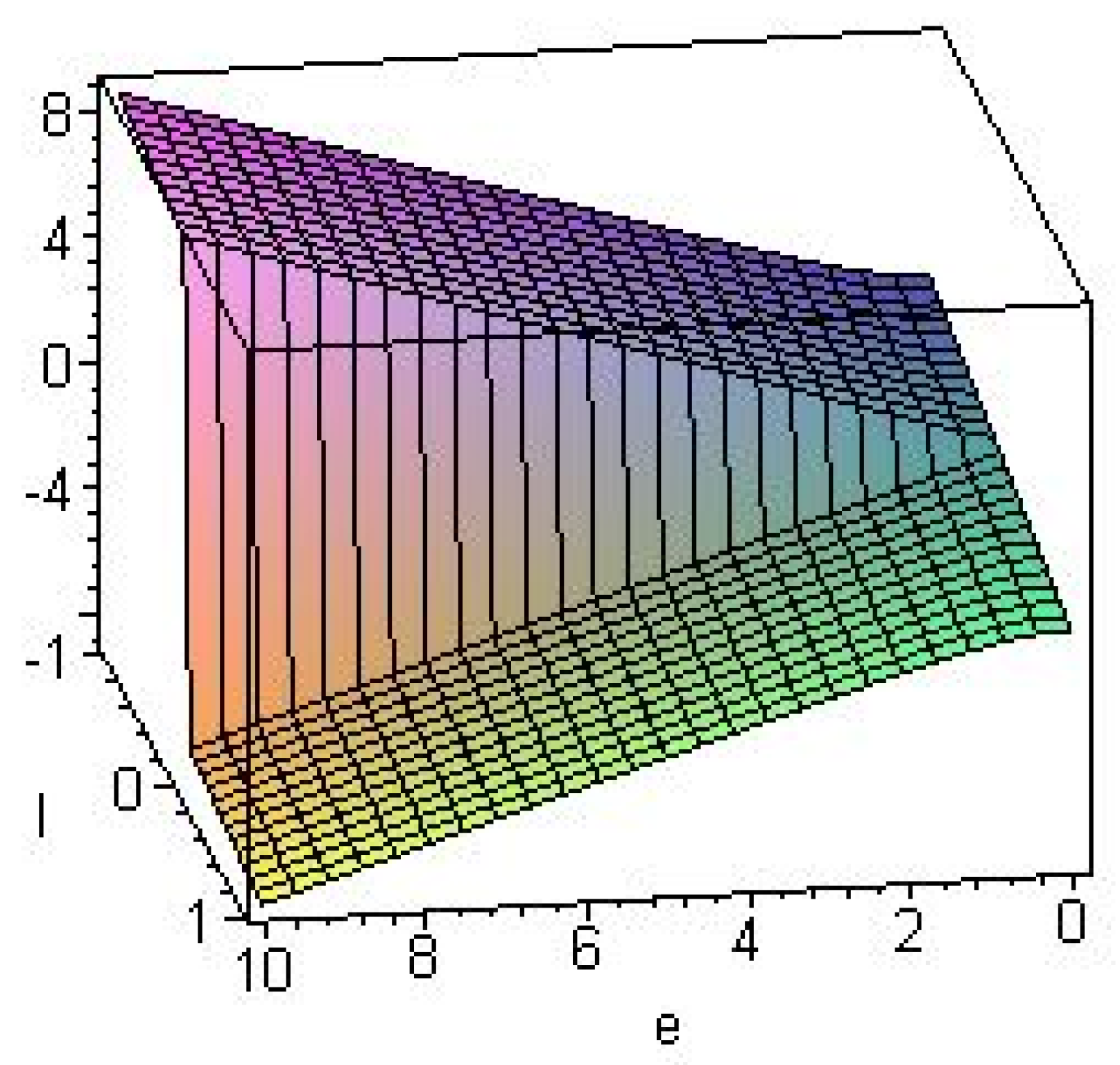 As mentioned the previous case, we find in this case, in the range of and , that the fluctuation of the components lie in a negative interval. Namely, the components lie in , while the components lie in . This shows that the topological Einstein–Yang–Mills black hole in arbitrary space-time dimension are locally unstable configurations with respect to the fluctuations of the . In fact, the range of the growth of happens to be in the same negative limit of the amplitude under the flow of the parameters . Explicitly, from Figure 13 and Figure 14 we observe that the of growth of the and takes place in the limit of a large l for all e. On the other hand, the component involving two distinct parameters of black hole has been depicted in Figure 15. In this case, we notice that Figure 15 shows that the -component of the mass fluctuations lies in the interval . Thus, for a given ensemble of higher dimensional topological Einstein–Yang–Mills black holes, the components of the metric tensor indicate that the fluctuations involving the vacuum parameters have relatively meager positive numerical values and thus they are prone to yield a statistically unstable ensemble at this order of the ADM mass.