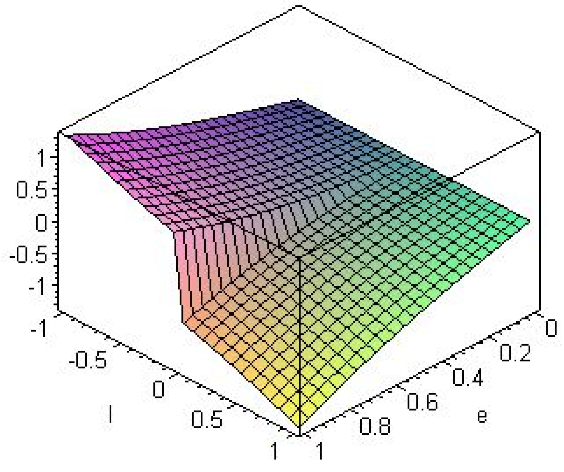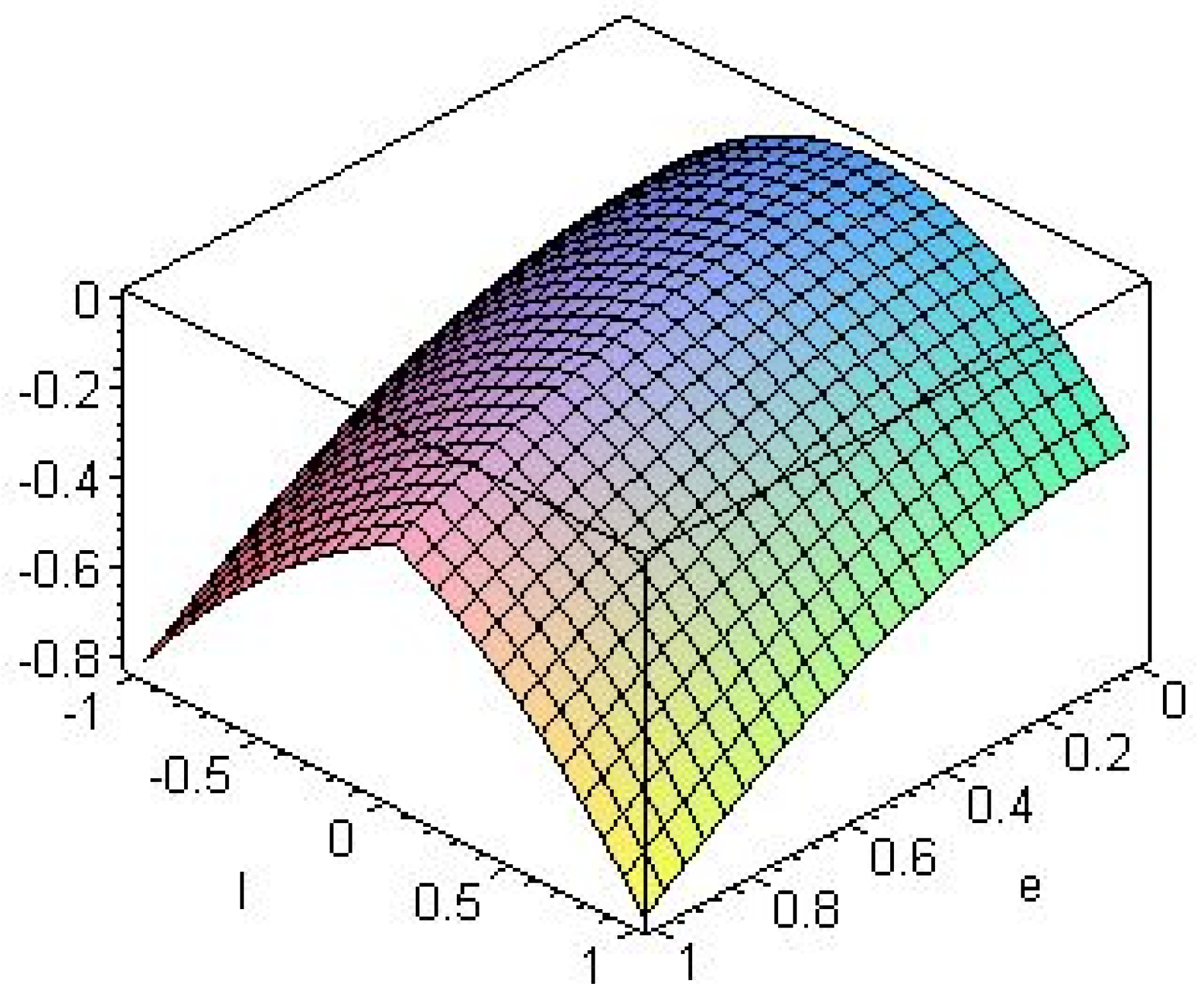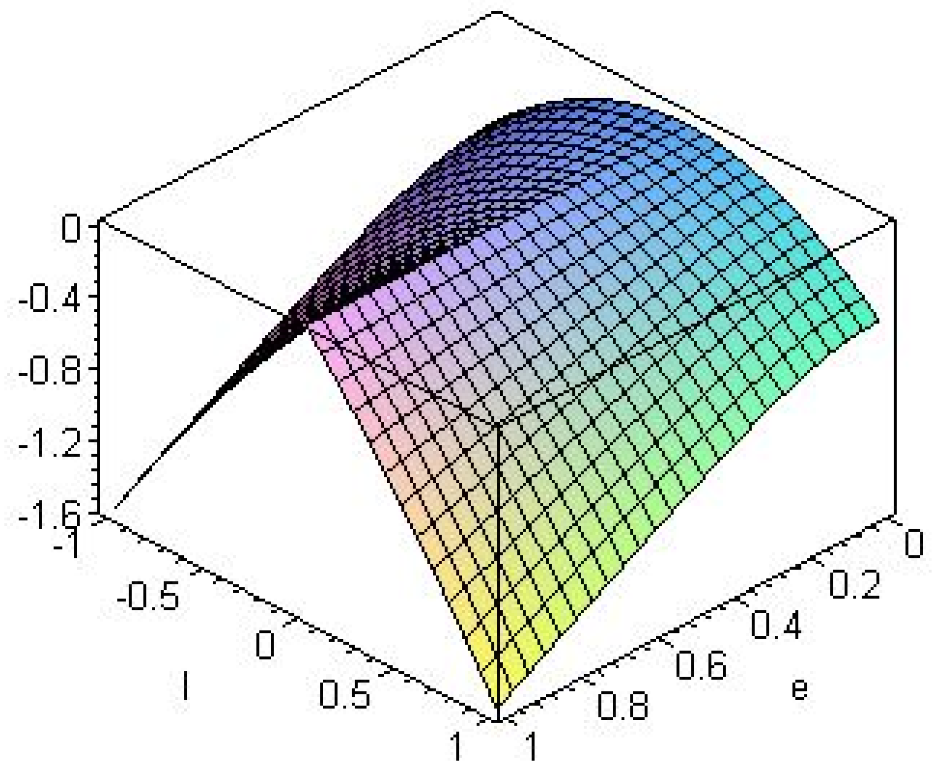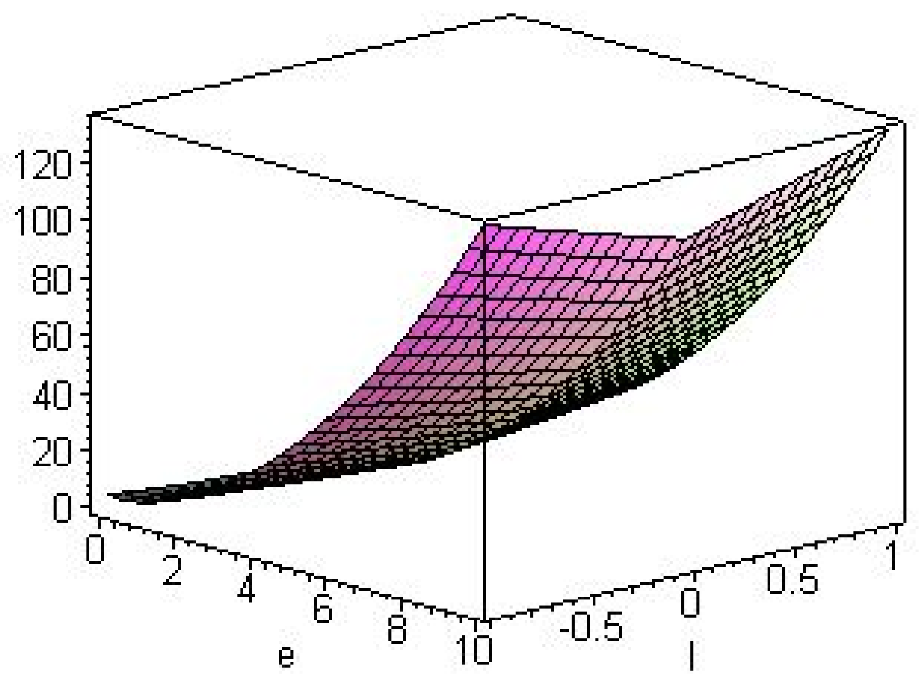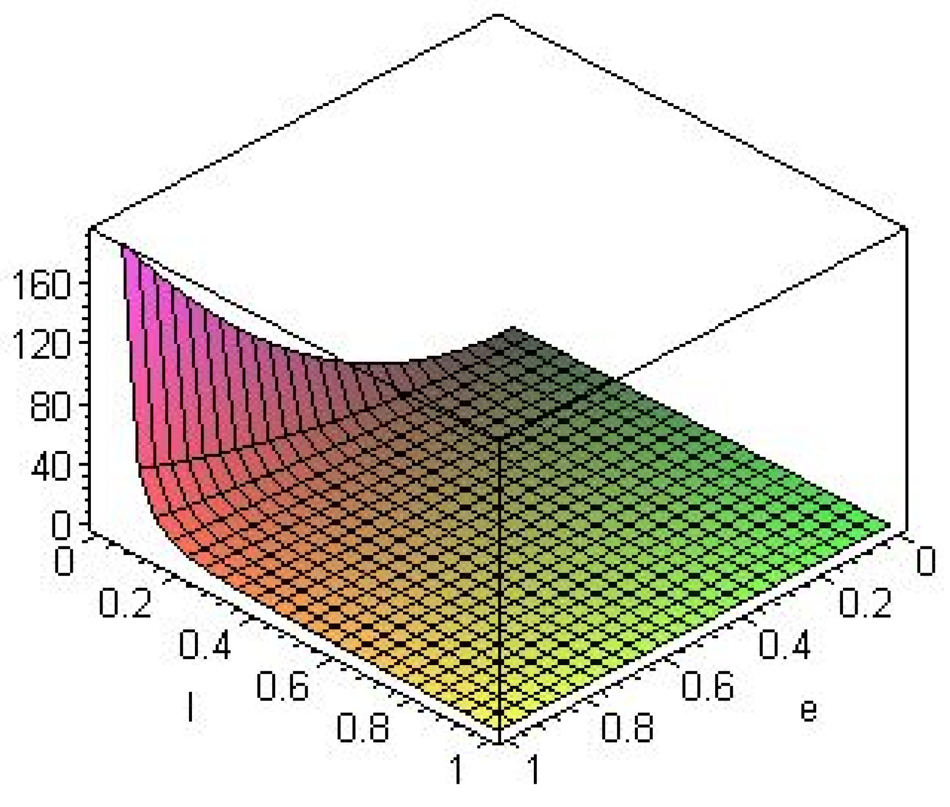 As mentioned the previous case, we find in this case, in the range of and , that the fluctuation of the components lie in a negative interval. Namely, the components lie in , while the components lie in . This shows that the topological Einstein–Yang–Mills black hole in arbitrary space-time dimension are locally unstable configurations with respect to the fluctuations of the . In fact, the range of the growth of happens to be in the same negative limit of the amplitude under the flow of the parameters . Explicitly, from Figure 13 and Figure 14 we observe that the of growth of the and takes place in the limit of a large l for all e. On the other hand, the component involving two distinct parameters of black hole has been depicted in Figure 15. In this case, we notice that Figure 15 shows that the -component of the mass fluctuations lies in the interval . Thus, for a given ensemble of higher dimensional topological Einstein–Yang–Mills black holes, the components of the metric tensor indicate that the fluctuations involving the vacuum parameters have relatively meager positive numerical values and thus they are prone to yield a statistically unstable ensemble at this order of the ADM mass.