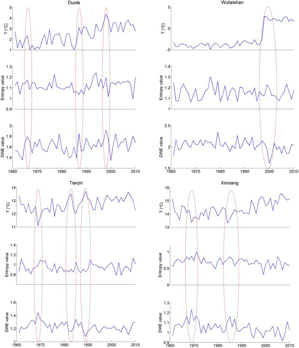 The DWE results of four daily temperature series were computed (Figure 2), and they were also compared with the observed series and conventional entropy results for verification. The DWE values of those main abrupt changes of each observed temperature series were focused on. At the Duole station, a clear change from declining temperature to stable temperature in 1967 corresponds to an abrupt DWE increase, and two obvious temperature increases in 1987 and 1997 also correspond to two abrupt DWE increases. At the Wutaishan station, the obvious temperature increase at around 2000 corresponds to the abrupt DWE decrease. At the Tianjin station, the obvious temperature decrease in 1969 corresponds to an abrupt DWE increase, and two obvious temperature increases in 1980s also correspond to two abrupt DWE decreases. At the Xinxiang station, two obvious temperature decreases in 1969 and 1986 correspond to two abrupt DWE increases.