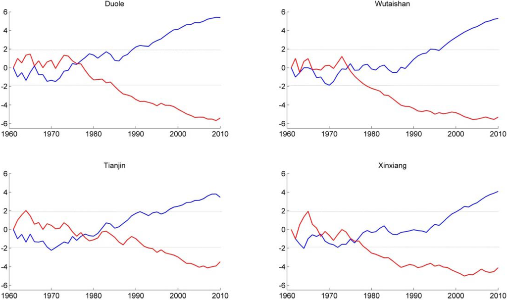 The observed annual average temperature series in Figure 2 clearly show the main abrupt changes during 1960s–1990s. The temperature measured at the Duole station declines in the 1960s, is stable in 1970–1985, but increases afterwards. The temperature measured at the Wutaishan station obviously increases around the 2000s. The temperature measured at the Tianjin station declines in the 1960s, but obviously increases twice in the 1980s. The temperature measured at the Xinxiang station declines in the 1960s, is stable in the 1970s, obviously declines around 1985, and then increases afterwards.