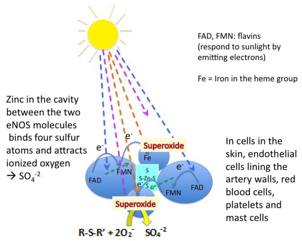 In this paper, we propose that the biophysical effects of pro-inflammatory cationic surfactants on cell membrane function, mediated by water, provide the provocation that induces SDS. Under our hypothesis, polycationic surfactants are proinflammatory agonists. The downstream anti-inflammatory counter-regulatory effectors, which balance out the hyper-permeable state, are hydrogen sulfide (H2S), inorganic sulfate, and the bio-sulfates. The restoration of basal permeability and/or promotion of enhanced barrier integrity are based on adequate sunlight exposure and adequate dietary sulfur, cholesterol, and zinc. Recent studies by Chen and Mehta and Kleinbongard demonstrated that human erythrocytes possess an active and functional eNOS that is located within the plasma membrane [127,128]. It is with these background studies clearly in mind that we are led to introduce here a key novelty, the “Seneff hypothesis,” the concept that membrane bound endothelial and erythrocytic nitric oxide synthase (eNOS), in the presence of caveolin-1, and sunlight, oxidizes H2S to sulfate [114]. See Figure 2. To wit, the zinc-tetrathiolate complex, situated in a cavity formed between the two monomers of the eNOS dimer, is the proposed site of endogenous sulfate biosynthesis, with superoxide being provided for the reaction as a consequence of sunlight exposure to the flavins, FMN and FAD. We propose further that Ch-S, sulfated glycolipids, and sulfated GAGs form as subsequent reaction products.