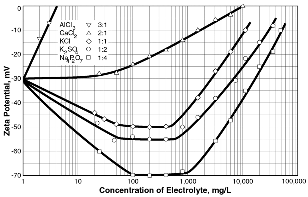 Zeta potential data for various electrolytes in an anionic colloidal suspension of 100 ppm Minusil [132]. Data were originally published per Thomas M. Riddick (1968) in [132] and are reproduced here with permission of Zeta-Meter, Inc. (Staunton, VA, USA).