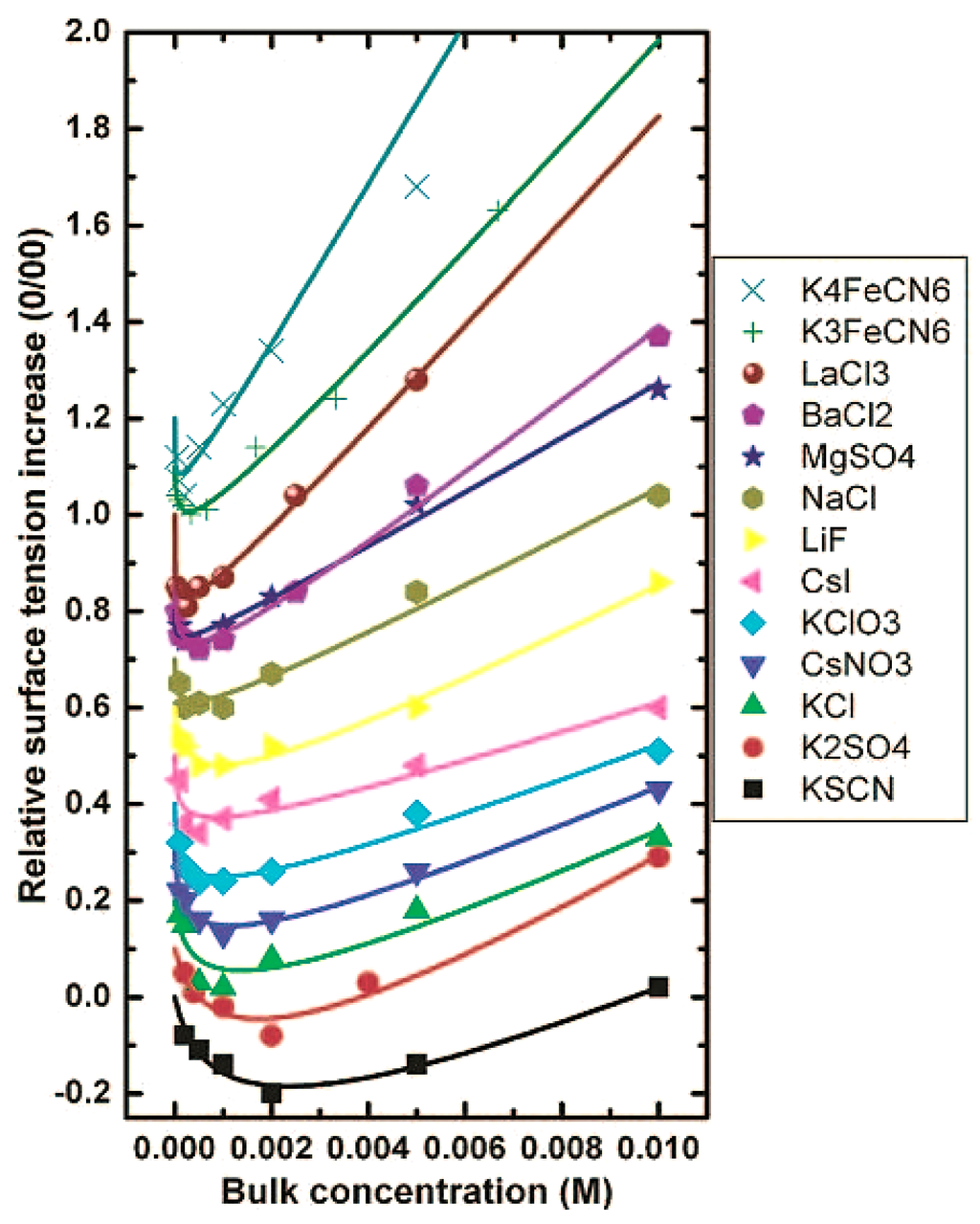 Surface tension data for all 13 Jones-Ray electrolyte solutions. The points are the original data from 1937 by Jones and Ray [166]. The change in the surface tension of all 13 Jones-Ray salts were fitted to a simple model by Petersen and Saykally [167,168,188]. Good agreement was found with even larger surface adsorption energies as determined in second harmonic generation (SHG) experiments in the ultraviolet range. Reproduced here with permission from Journal of the American Chemical Society [188]. Copyright 2005 American Chemical Society.