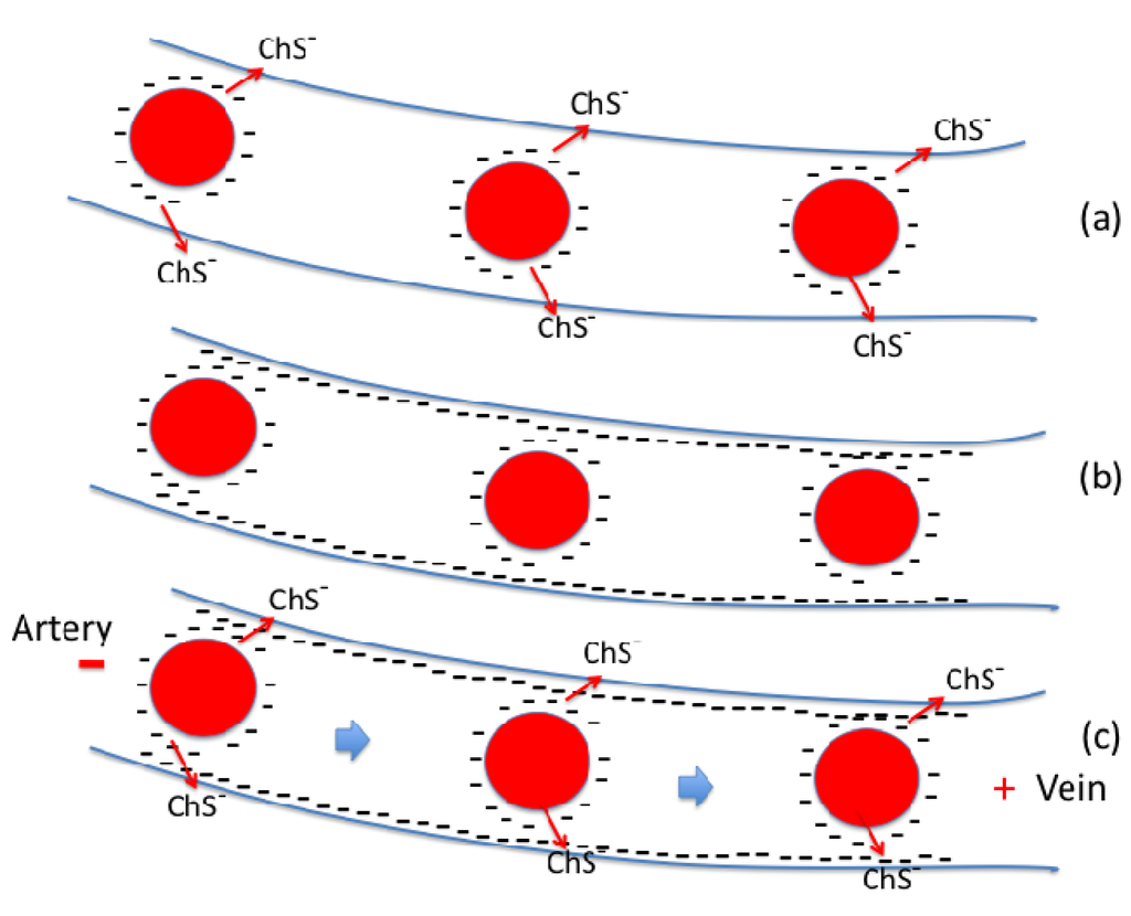 Adequate endogenous and dietary cholesterol is essential in maintaining proper cell membrane function [114,115,116,117], as is adequate endogenous and dietary sulfur [114,118]. The surface charge of RBCs plays a significant role in cell-to-cell interactions [248]. We propose that it is primarily the negatively-charged sulfate head-groups imparted to RBC and endothelial cell membranes that are responsible for both their net and specific surface charge [130]. We propose that this is one of the mechanisms by which cell membranes are able to store energy [249,250,251,252]. The amphiphilic property of Ch-S endows it with extremely facile, dynamic intercellular and intracellular mobility. We further suggest the novel concept that RBCs may actually discharge negative charge by unloading sulfate onto the endothelial wall, as illustrated in Figure 5. In part due to their higher concentration of CO2, veins are more acidic than arteries, which suggests that there is an electric field that would propel negatively charged particles in the capillaries towards the veins. This process would be renewable as the RBCs travel through superficial veins, regenerating their supply of Ch-S through a process catalyzed by sunlight exposure [114,116,253].