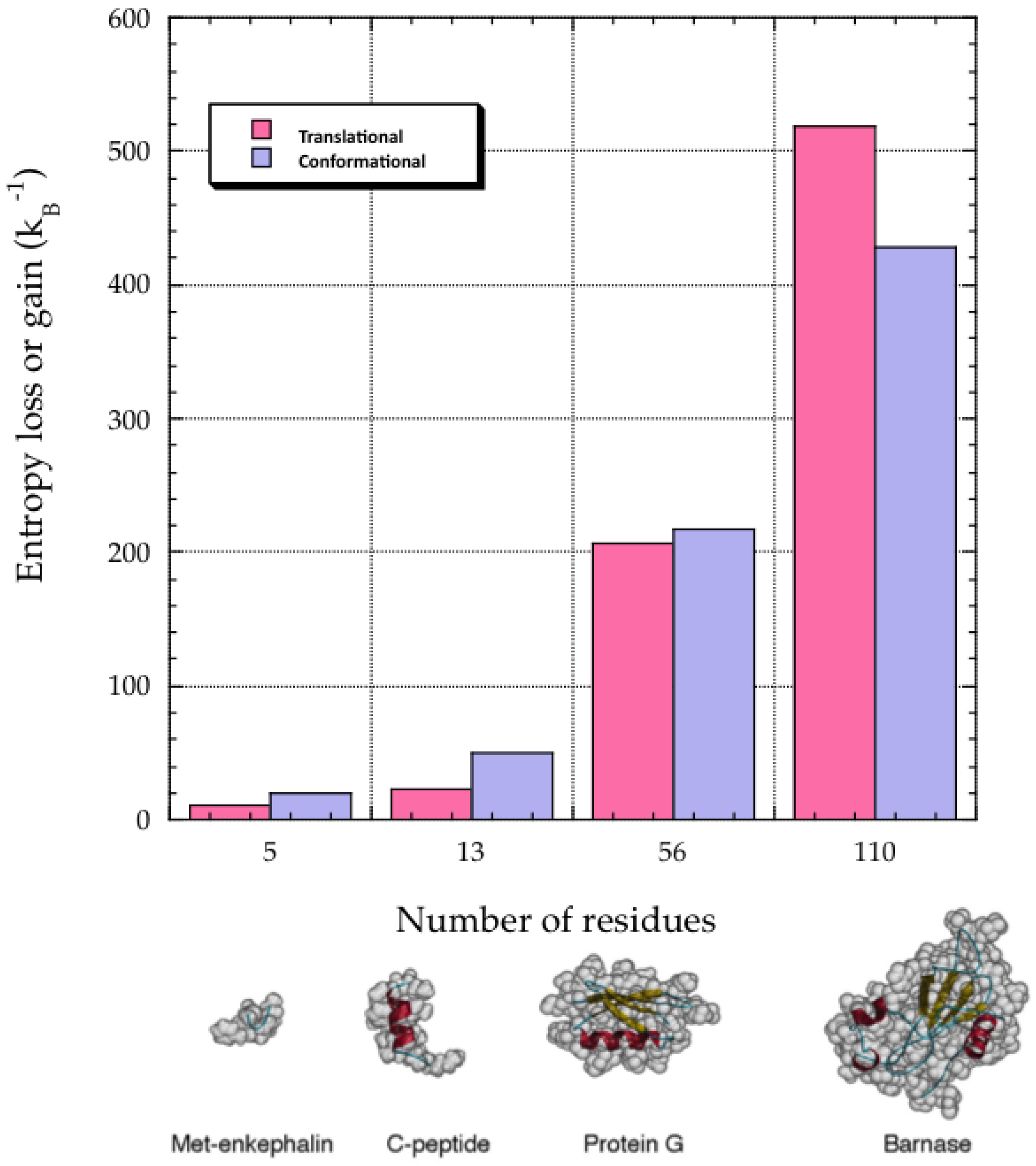 The key quantity we analyze is the TE of the solvent water in which the peptide or protein molecule is immersed. As an example, two peptides—Met-enkephalin (PDB ID: 1PLX) and the C-peptide fragment consisting of the 1–13 residues of ribonuclease A (PDB ID: 2AAS)—and two proteins—protein G (PDB ID: 2GB1) and barnase (PDB ID: 1BNR)—are considered. The TE gain upon folding is compared to CE loss. The CE change upon unfolding can roughly be estimated as the sum of (ln9)NRkB and 1.7 NRkB, which represent the contribution from the main chain and side chains of a protein, respectively [27]. We showed that when the number of residues is sufficiently large and the solvent is water (Figure 2), the TE gain is a powerful driving force and substantially competes against the very large CE loss [25,26].