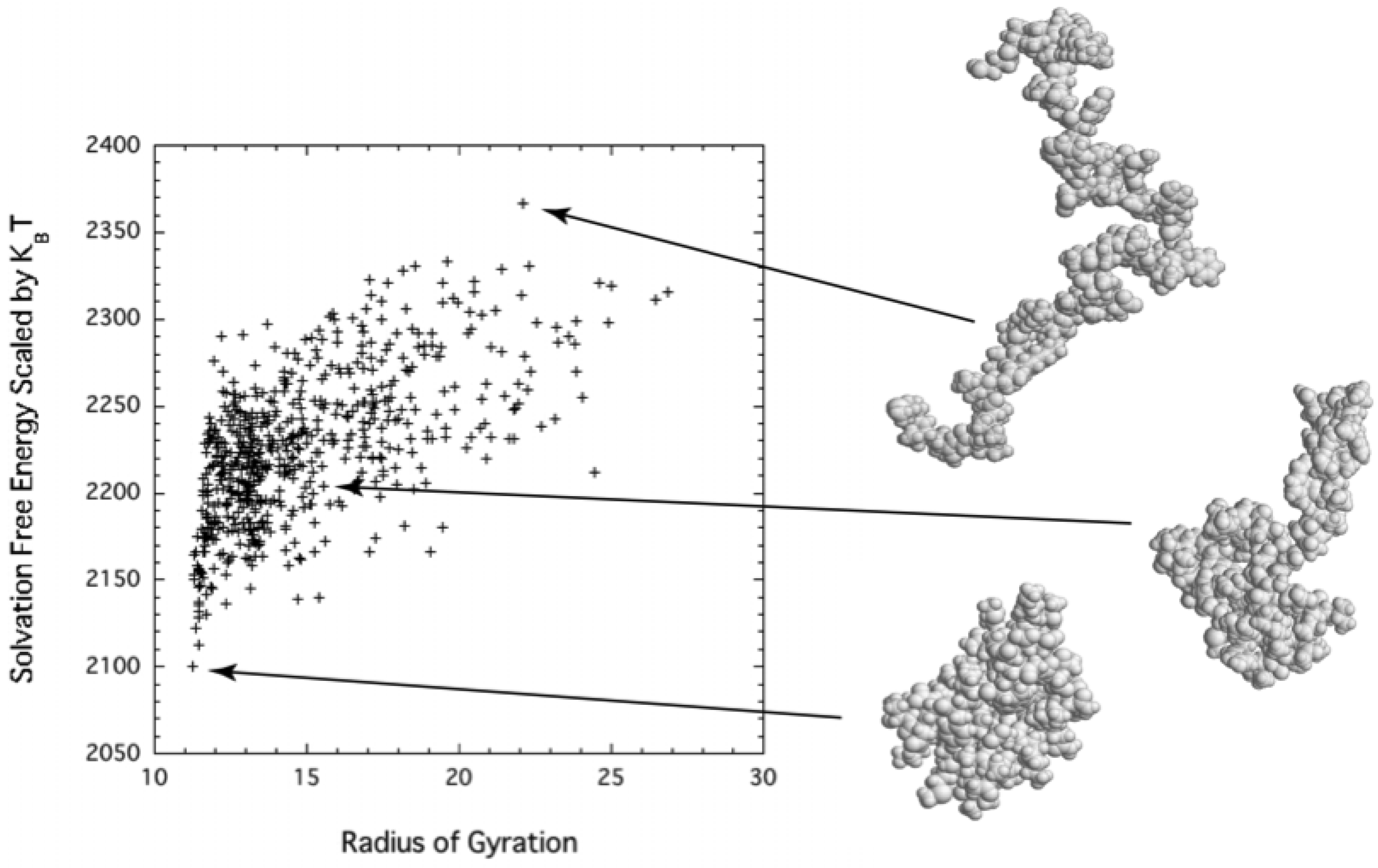 Solvation free energies obtained from 3D integral-equation theory for different structures of protein G (2GB1) as a function of the radius of gyration [28]. A total of 600 structures obtained from a molecular dynamic simulation are plotted.
