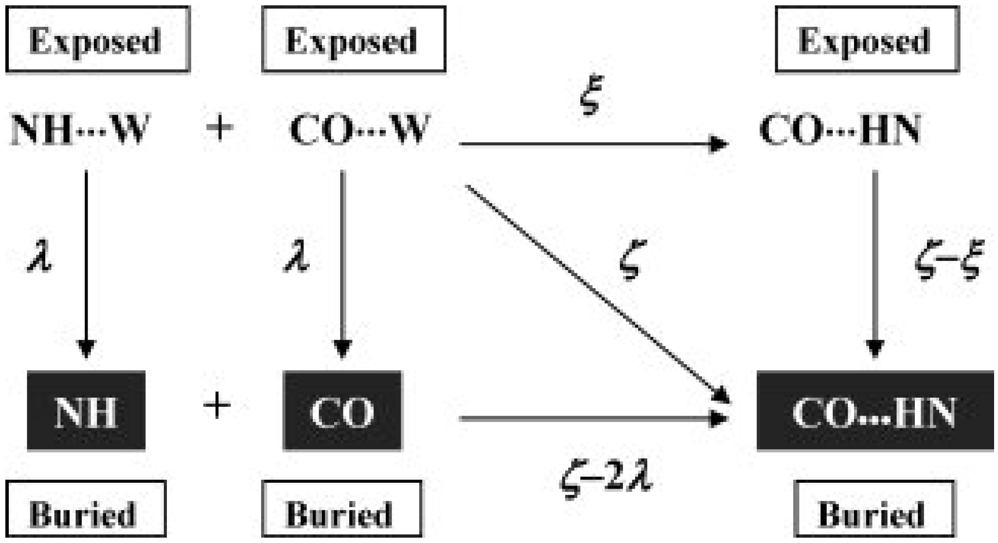 The scheme for calculating the total dehydration penalty. “W” and “···” represent a water molecule and a hydrogen bond, respectively. An amide NH and CO are depicted as an example. The parameters ζ, λ, and ξ are changeable.