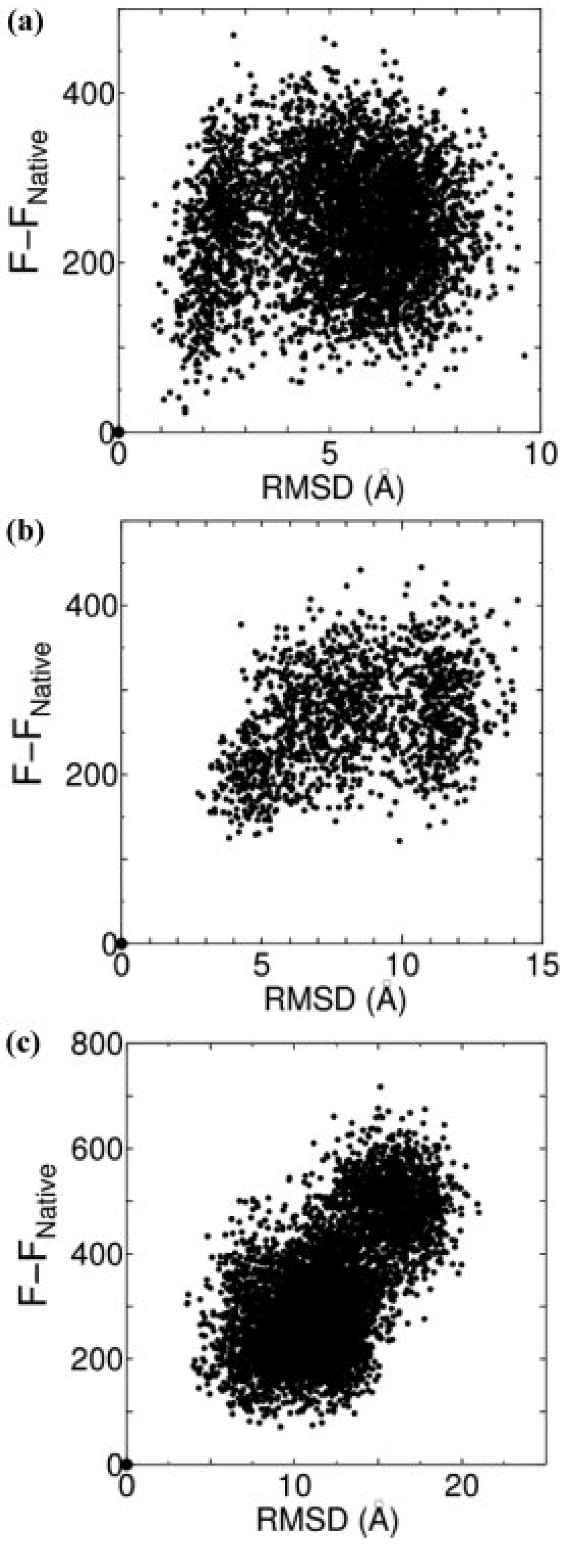 F − FNative plotted against Cα-RMSD from the native structure. Each figure collects data for all proteins in the decoy set of 4state_reduced (a), fisa (b), and fisa_casp3 (c). Native structures are represented by the origin (0, 0) of the plots.