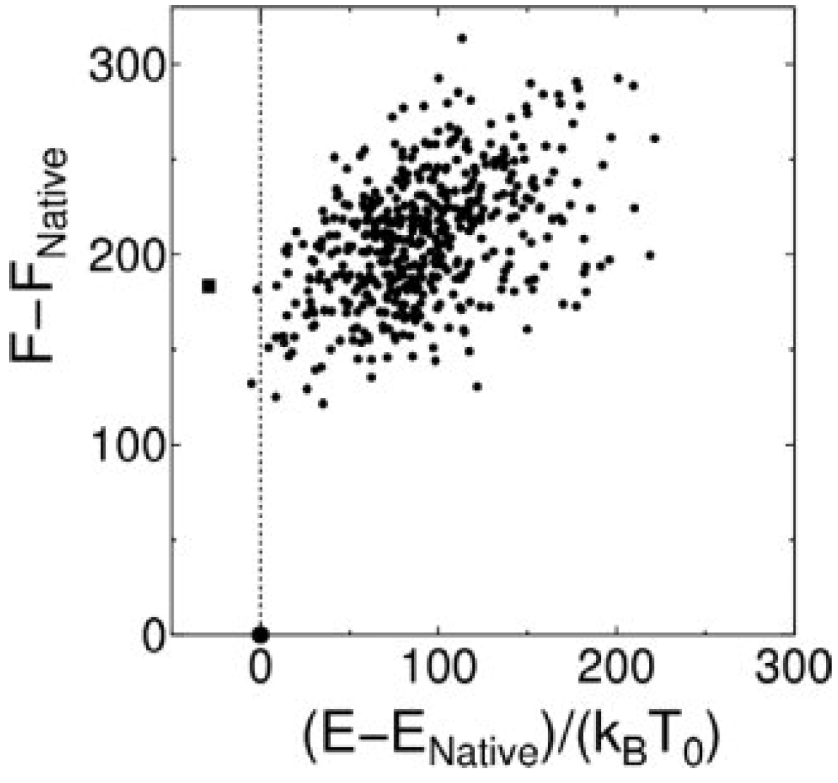 Relation between F − FNative and (E − ENative)/(kBT0) for 1hdd-C in the fisa decoy set. F (note that this is already scaled by kBT0; T0 = 298 K) is our free-energy function, and E is the CHARMM22+CMAP+GBMV/SA. The square and the large circle represent the result of an all α-helix structure and the native structure, respectively.