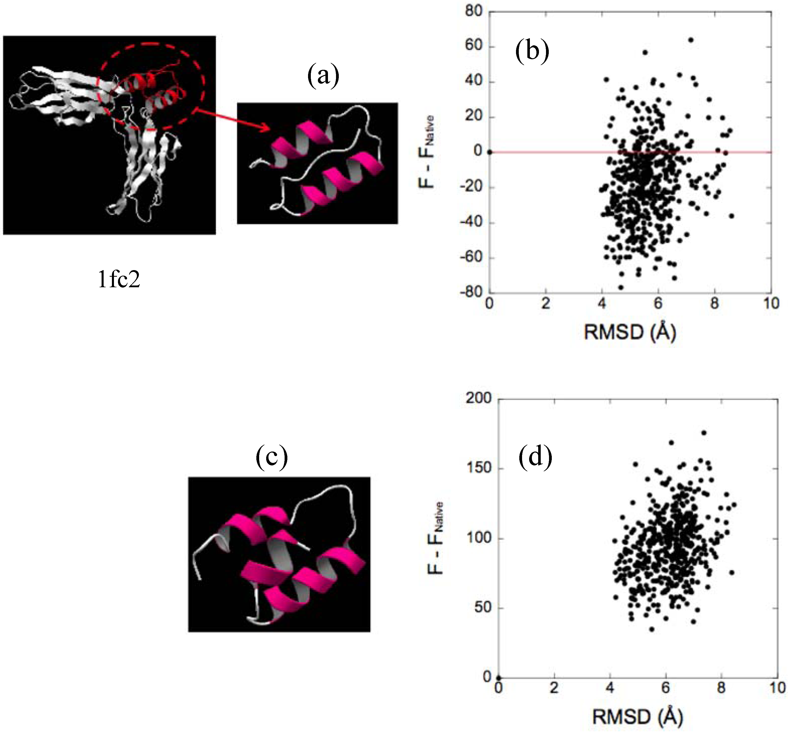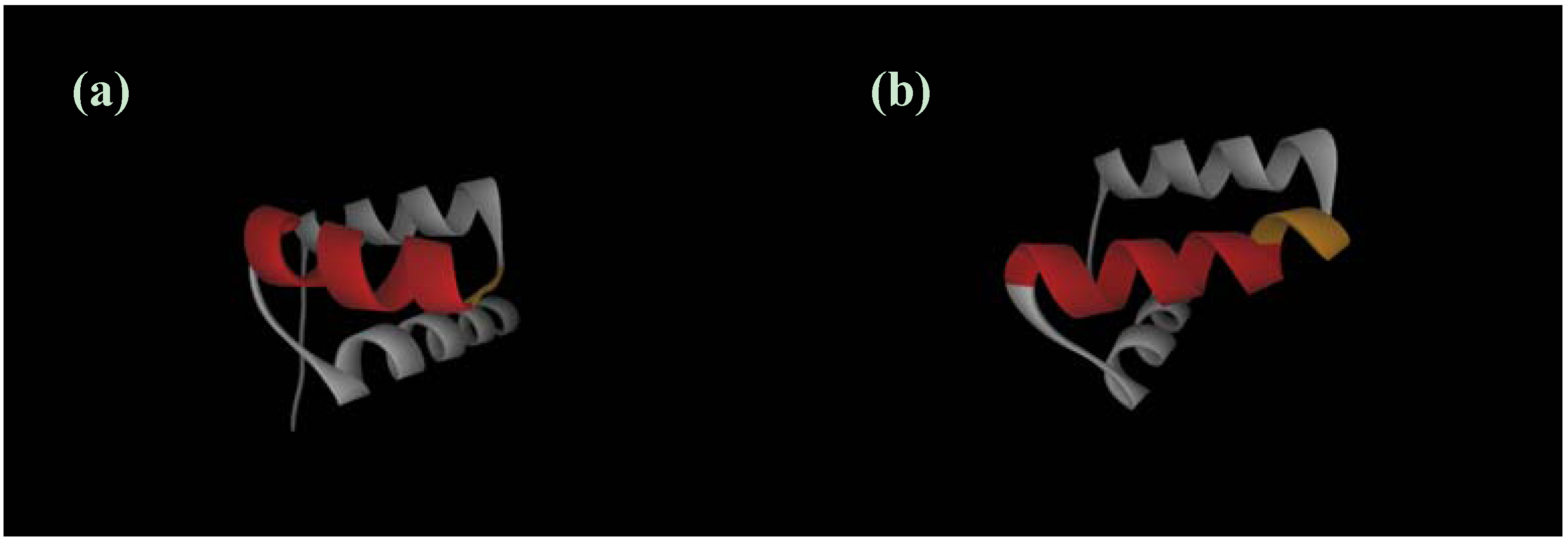 It is worthwhile to compare our free energy function with a representative physics-based function. Here, we employ CHARMM, one of the most widely used force fields, which includes the CHARMM22 [67] + CMAP [68] (MM) + Generalized-Born Approximation [69,70,71] (GBMV) +Accessible Surface Area method (SA). The GBMV is reportedly capable of reproducing the potential energy calculated by the Poisson–Boltzmann method and that from the molecular dynamics simulation combined with an explicit water model. The MM+GBMV/SA tested does not always successfully discriminate the native structure from the decoys. We found a typical case in the decoy set for 1hdd-C. The relation between our function F and MM+GBMV/SA is shown for 1hdd-C in the fisa decoy set in Figure 6. The F generally gives much higher energy values for all the decoy structures than does MM+GBMV/SA. As observed in the figure, there are two decoy structures for which MM+GBMV/SA identifies lower energy values than the native. These two structures contain more α-helical structure than the native structure. In Figure 6, one of the two decoy structures is illustrated for comparison with the native structure. We explore the relation between the α-helix content and the energy value of our function and MM+GBMV/SA. A hypothetical all α-helix structure was also considered (Figure 7). As observed in Table 2, MM+GBMV/SA values tend to be lower for structures with higher α-helix content. The present result is consistent with studies showing that the CHARMM22 force-field parameters have a preference for α-helix conformations [72,73]. The hydration entropy in our free‑energy function of the decoy structures is much larger than that of the native structure. It is quite reasonable that all α-helix structures, which have a relatively larger excluded volume for water, is unfavorable in terms of the hydration entropy [25,26]. The water entropy for the decoy structure is lower than that for the native structure by ∼98 kB. In contrast, an all α-helix structure has less dehydration penalty than a native structure because it can form intramolecular hydrogen bonds in a complete manner. The relation between structure and energy terms is discussed in the next subsection.
