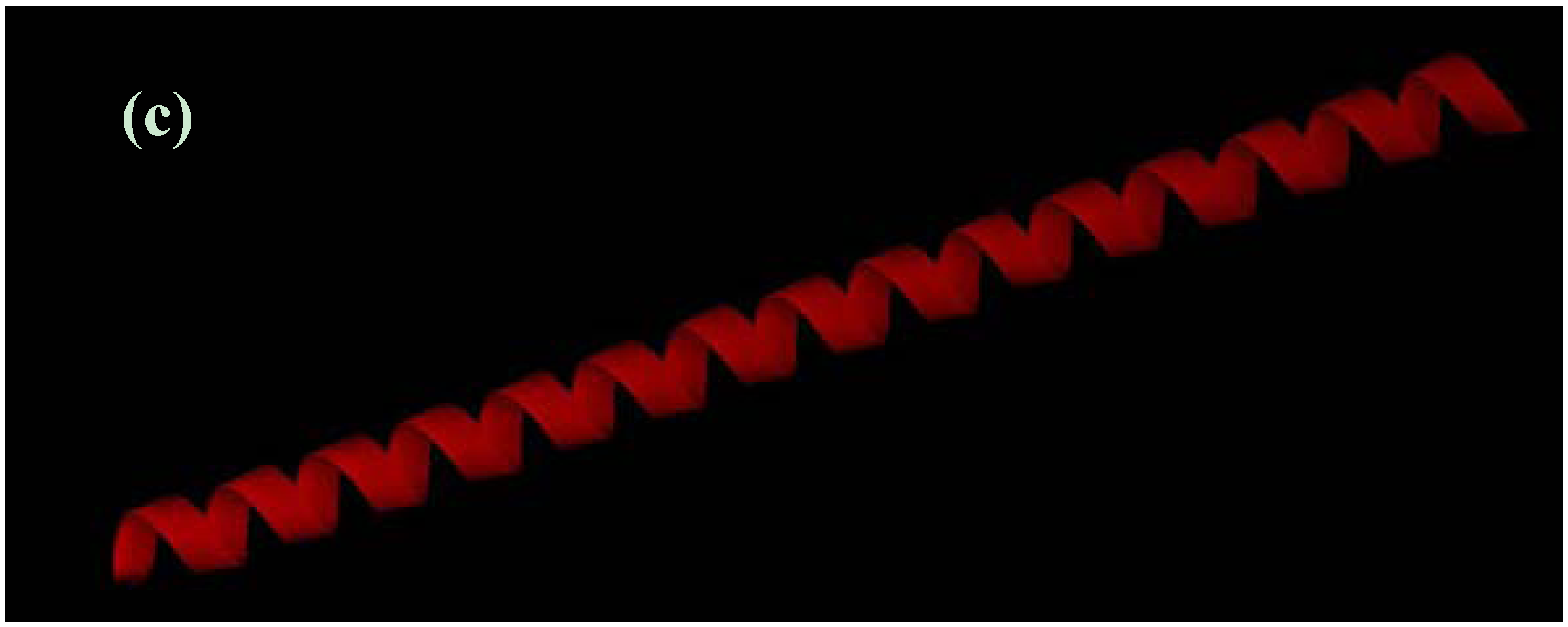 Ribbon representation of examined protein structures. (a) The native structure of 1hdd-C. (b) Structure with the lowest value of CHARMM22+CMAP+GBMV/SA in the decoy set. (c) All α-helical structure with the same amino-acid sequence.
