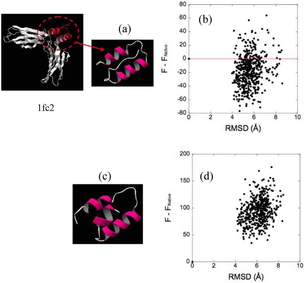 The plot of F − FNative (the subscript “Native” denotes the value for the native structure) against the root mean square displacement (RMSD) for Cα atoms from the native structure is shown for the three representative decoy sets in Figure 5. The data for all of the protein species contained in each decoy set are collected in the figure. In Table 1, the number of decoy sets for which our energy function identifies the native structure as the lowest value is listed. As observed in the table, our function is successful in discriminating the native fold from misfolded decoys with 100% accuracy, except for lmds decoy sets (the lack of success in these decoy sets is justified in the next subsection). This success supports our arguments around hydration, described above, and the validity of the energy function.