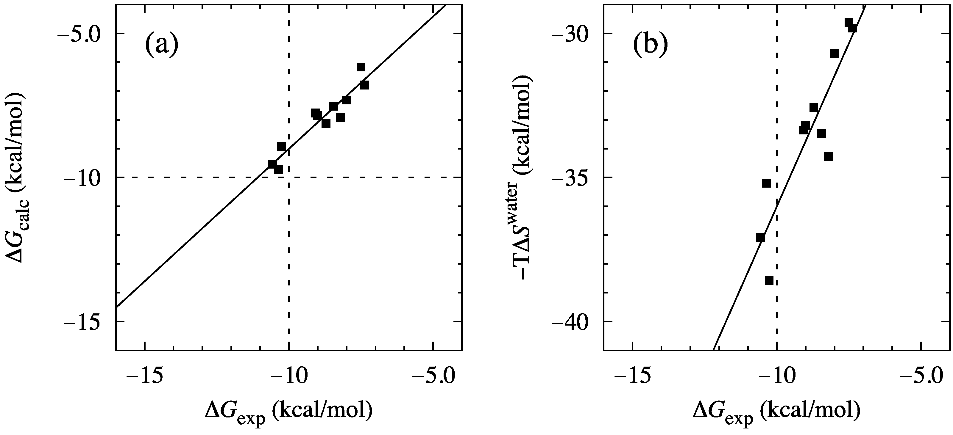 (a) Plots of ΔGcalc vs. ΔGexp for FKBP12 and its 11 ligands. (b) Plots of −TΔSwater vs. ΔGexp.