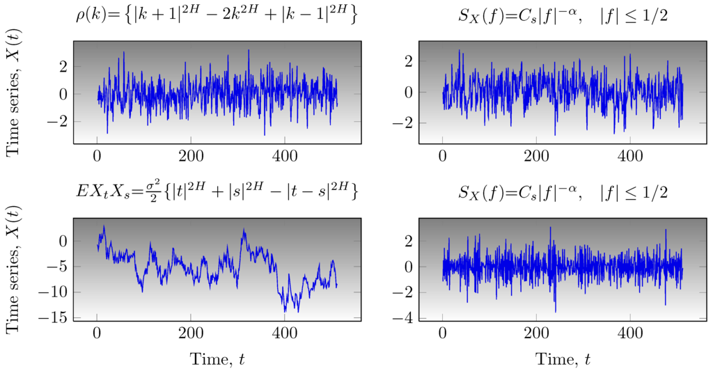 where is a constant, the scaling index and represent the lower and upper bound frequencies upon which the power-law scaling holds. Depending upon , and α, several particular scaling processes and behaviours can be identified. Independently of α, local regularity and band-pass power-law behaviour is observed whenever and respectively. When the scaling-index α is taken into consideration, long-memory behaviour is observed when both and . Self-similar features (in terms of distributional invariance under dilations) are observed in all the scaling-index range for all f. Scaling-index α determines not only the stationary and non-stationary condition of the scaling process but also the smoothness of their sample path realizations. The greater the scaling index α, the smoother their sample paths. As a matter of fact, as long as , the scaling process is stationary (or stationary with long-memory for small f and ) and non-stationary when . Some transformations (e.g., the Lamperti transformation) can make a stationary process appear non-stationary and vice versa. Outside the range , several other processes can be identified, e.g., the so-called extended fBms and fGns defined in the work of Serinaldi [15]. The persistence of scaling processes can also be quantified by the index α and within this framework, scaling processes possess negative persistence as long as , positive weak long-persistence when and positive strong long-persistence whenever . Scaling signals encompasses a large family of well-known random signals, e.g., fBms, fGns [22], pure power-law processes [21], multifractal processes [3], etc. FBm, , comprises a family of Gaussian, self-similar processes with stationary increments and because of the Gaussianity, it is completely characterized by its autocovariance sequence (ACVS), which is given by,