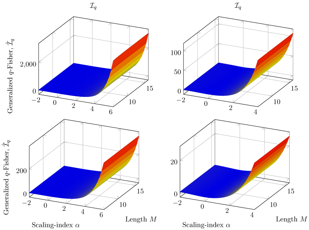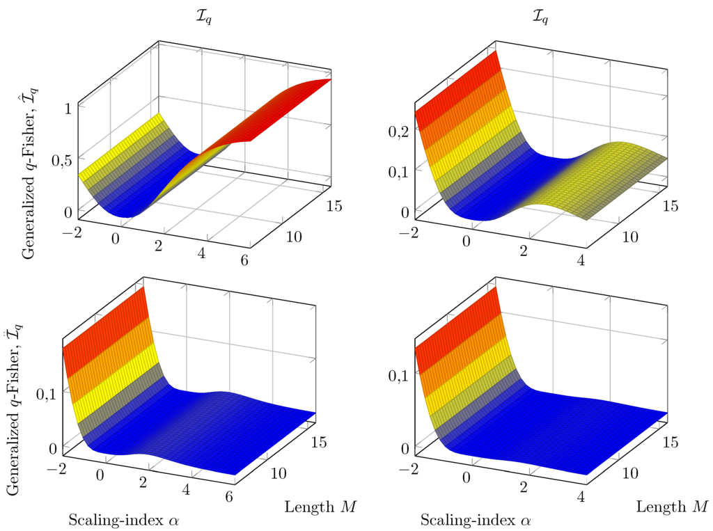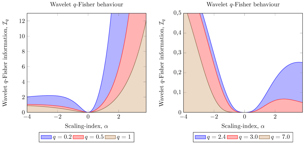 The wavelet q-Fisher information planes shown in Figure 2 display the Fisher information (in wavelet domain) for for various stationary and nonstationary scaling processes. Note that as , the wavelet q-Fisher information of nonstationary signals () increases exponentially. Nonstationary signals are therefore more perceptible or attain high Fisher’s information (when ) than stationary scaling signals. Note that as long as , the form of the wavelet q-Fisher information planes are similar in shape. This shape is preserved as long as . For the special case , a completely different behaviour is observed on Fisher planes. Also note that as long as , the stationary scaling signals Fisher information are small. Figure 3 displays the wavelet q-Fisher information plane for scaling signals when . When , wavelet q-Fisher information is symmetrical around and the Fisher information observed at the right of are identical to those observed at the left of that point. For , wavelet q-Fisher information is high for stationary signals and low for nonstationary ones. Note that this behaviour is contrary (opposite) to the behaviour observed for this quantifier when . Based on this, wavelet q-Fisher information reverses its behaviour as long as . The boundary , therefore, permits wavelet q-Fisher information to highlight nonstationary or stationary phenomena (or processes). For , nonstationary phenomena is zero. Figure 4 reviews the behavior observed in the wavelet q-Fisher information planes for and .
