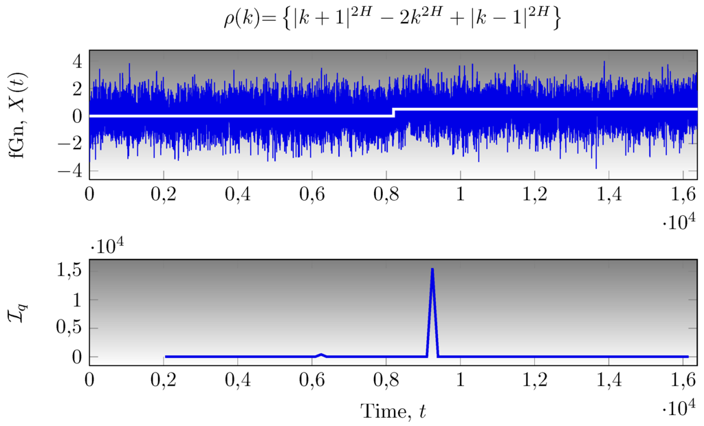 Figure 6 displays the level-shift detection capabilities of wavelet q-Fisher information for a self-similar, long-memory fGn with Hurst exponent and a single structural break embedded within its structure.