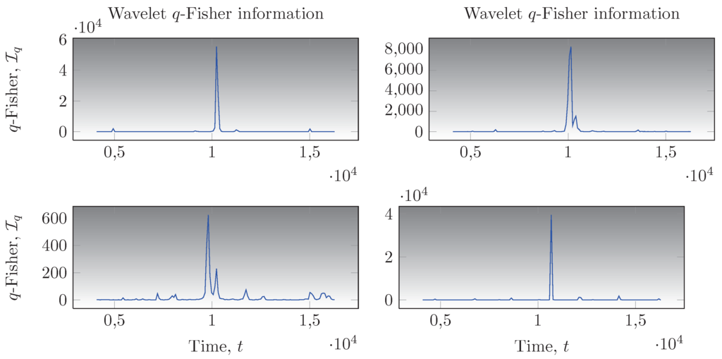 As stated above, parameter q provides further analysis flexibility and can highlight possible nonstationarities embedded in the signal under study. In this context, q-Fisher information is again a descriptor of the complexities associated to random signals and shares similar properties as the standard Fisher’s information in the sense that it is large for narrow probability density and also for highly oscillatory data.
