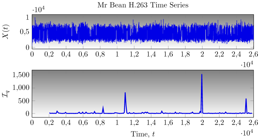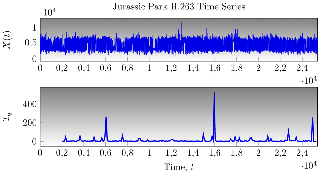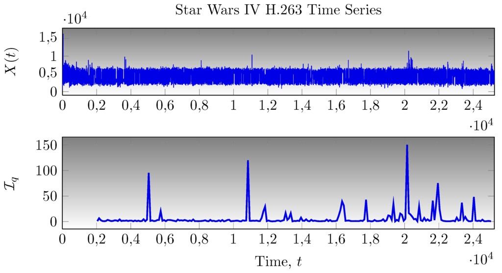 Figure 10 displays the time series obtained by encoding the Jurassic Park movie with H.263 algorithm and the wavelet q-Fisher information of the encoded video trace. The length of the time series is points and the wavelet q-Fisher information was computed with , and .