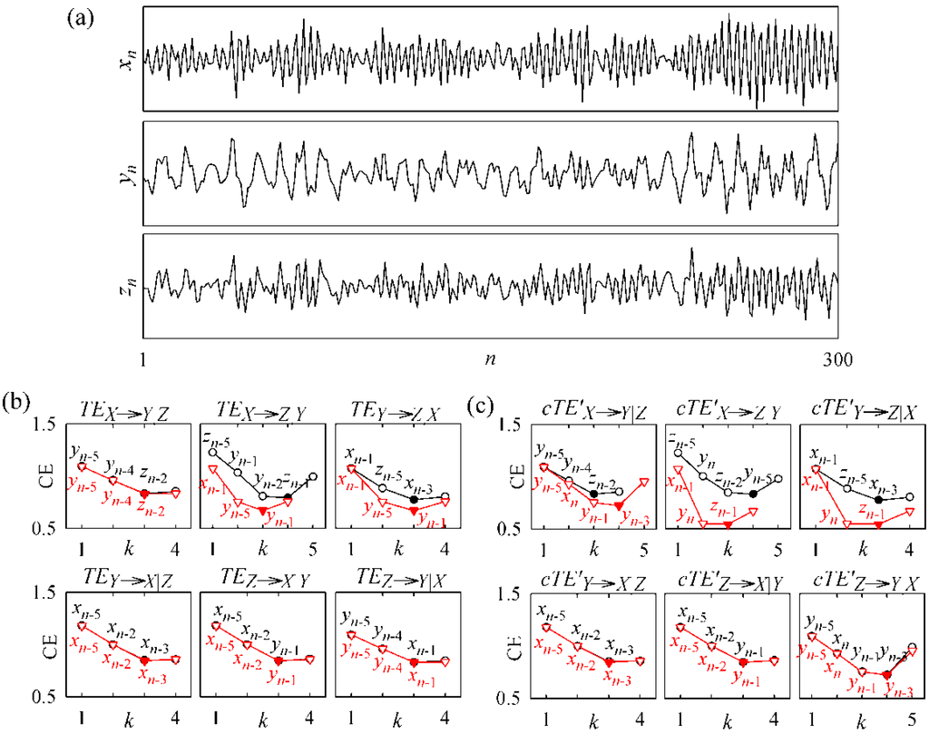 Example of transfer entropy analysis performed for the first simulation. (a) realization of the three processes generated according to (6). (b) TE estimation between pairs of processes based on nonuniform embedding; each panel depicts the CE estimated for the destination process through application of the non-uniform embedding procedure without considering the source process (black circles), or considering the source process (red triangles), in the definition of the set of candidates; the terms selected at each step k of the sequential embedding are indicated within the plots, while filled symbols denote each detected CE minimum. (c) Same of (b) for estimation of the compensated TE (cTE′).