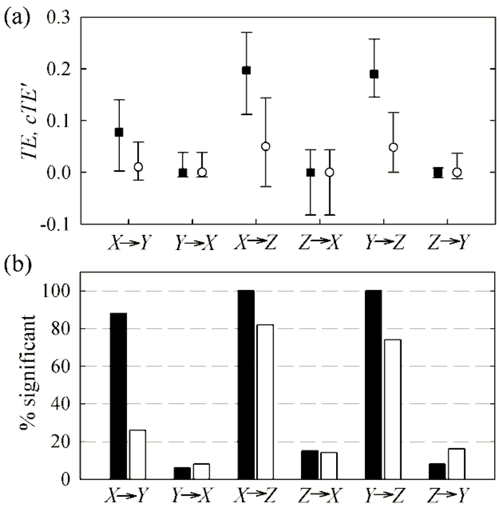The results of Figure 2a are further supported by the percentage of significant information transfer of Figure 2b. Indeed, while over the uncoupled directions the number of detected significant causal couplings is low and comparable for TE and cTE′ (the overall specificity is 87% for the TE and 90% for the cTE), over the coupled directions the number of detected significant couplings is substantially higher for cTE′ than for TE (the overall sensitivity is 61% for the TE and 96% for the cTE). Thus, in this situation with causally meaningful instantaneous interactions, utilization of the cTE in place of the traditional TE yields a better sensitivity in the detection of information transfer between coupled processes.