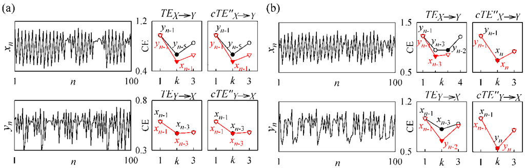 On the contrary, the selection of one or more terms from the input process during the second repetition of the procedure leads to a decrease in the CE minimum, and thus to the detection of a positive information transfer. For instance, considering the estimation of TE from Y to Z conditioned to X (upper right panel in Figure 1b) the vector resulting from the first embedding is [xn-1, zn-5, xn-3], while the second embedding selects at the second and third steps some past terms from the source process Y (i.e., the terms yn-5 and yn-1), so that the selected embedding vector changes to [xn-1, yn-5, yn-1] and this results in a reduction of the CE minimum with respect to the first embedding and in the detection of a nonzero information transfer (TEY→Z|X > 0).